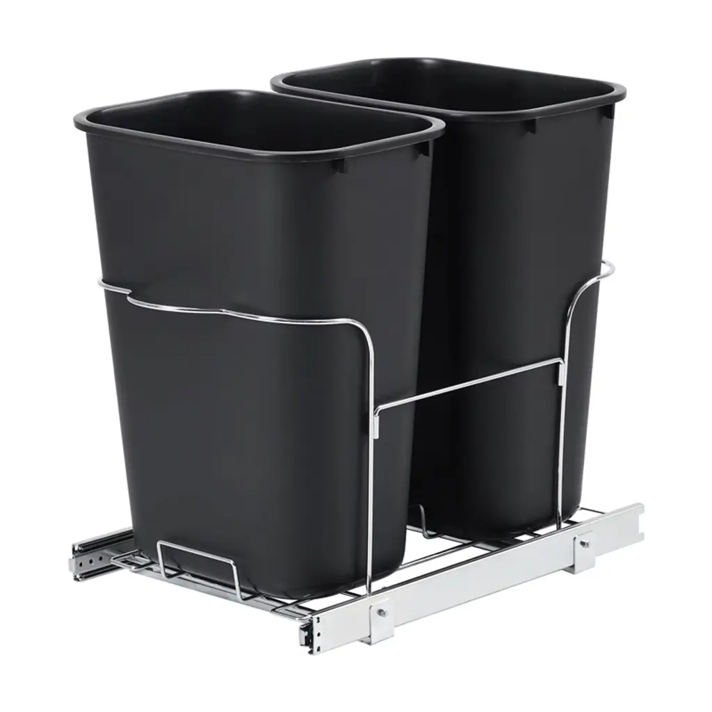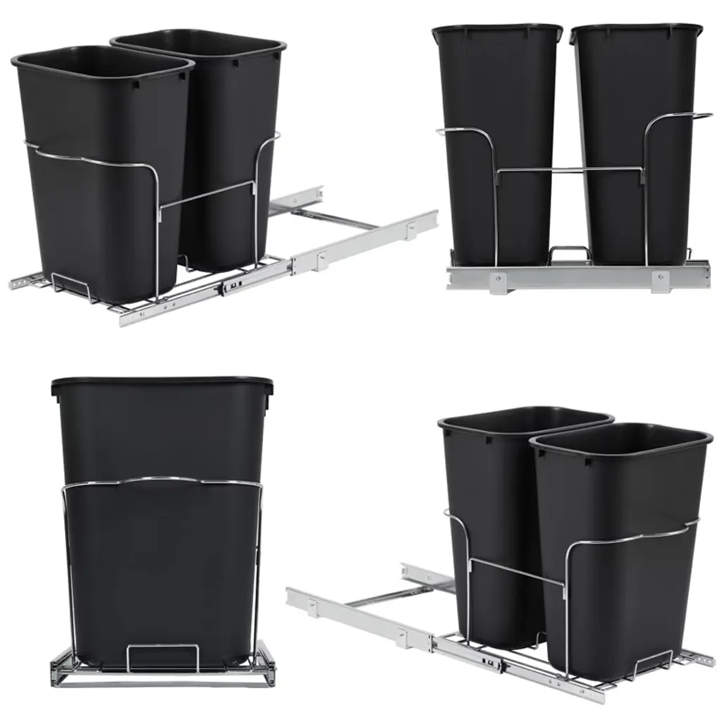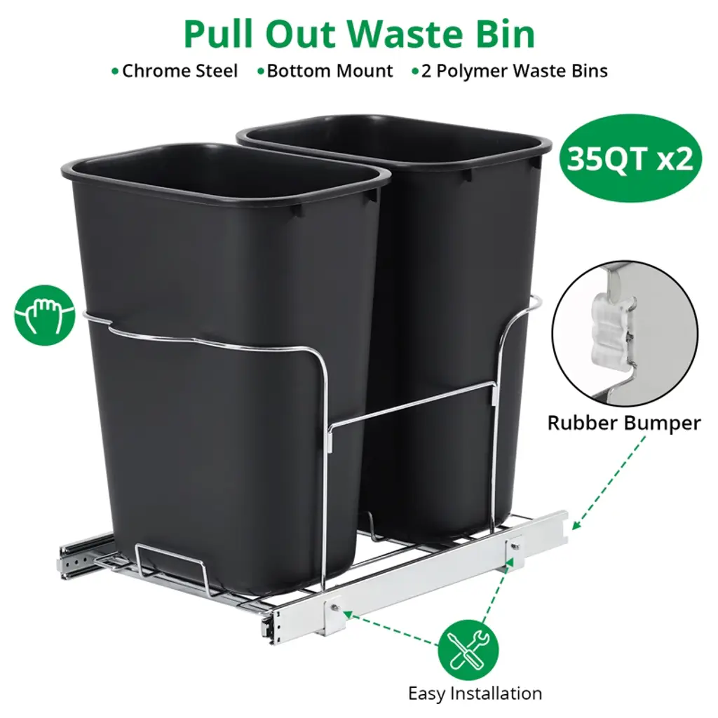 Product DescriptionMaximize your kitchen space with this sleek double pullout trash and recycling bin system. Designed for easy access and hidden storage, it features a durable, heavy-duty bracket that supports up to 100 lbs, ensuring stability without deformation. The eco-friendly bins promote waste separation and help keep your kitchen tidy and odor-free, while the quiet, smooth ball-bearing slide system ensures effortless operation. With a removable handle for cabinet door mounting (sold separately), this modern solution blends functionality with style, perfect for any kitchen setup. Easy to clean and versatile, it can also be used for pet food or kitchen tool storage.Product InformationColor: Black / GreyMaterial: PP+SteelItem Weight: 15/15.7/ 16.9 PoundsProduct Dimensions: 21.65 x 16.54 x 15.35/22.44 x 17.32 x 12.99/22.44 x 17.32 x 14.57 inchesCapacity: 2x25 / 2x30 / 2x35 QTOpening Mechanism: Pull-OutRoom Type: Dining RoomSpecial Feature: RustproofShape: RectangularFinish Type: UnfinishedPacking list:1x Pull Out Trash Can Under Cabinet1x Hardware Bag1x Assembly GuideFriendly note:For a perfect fit, double-check your cabinet measurements before mounting.Lightly wipe down the steel slides occasionally to maintain that effortless glide.Avoid overloading to keep the sliding action buttery-smooth.For best results, use trash bags that fit snugly within the compartments to avoid spills and ensure cleanliness.