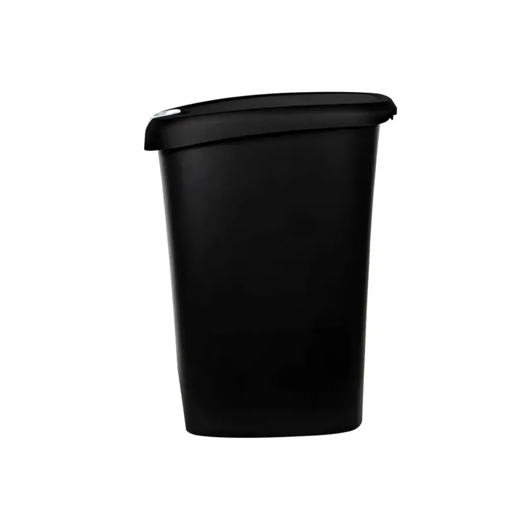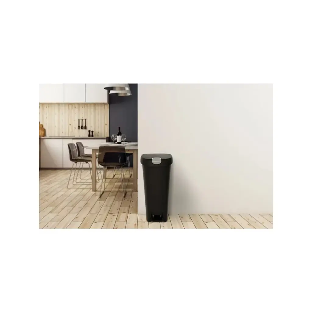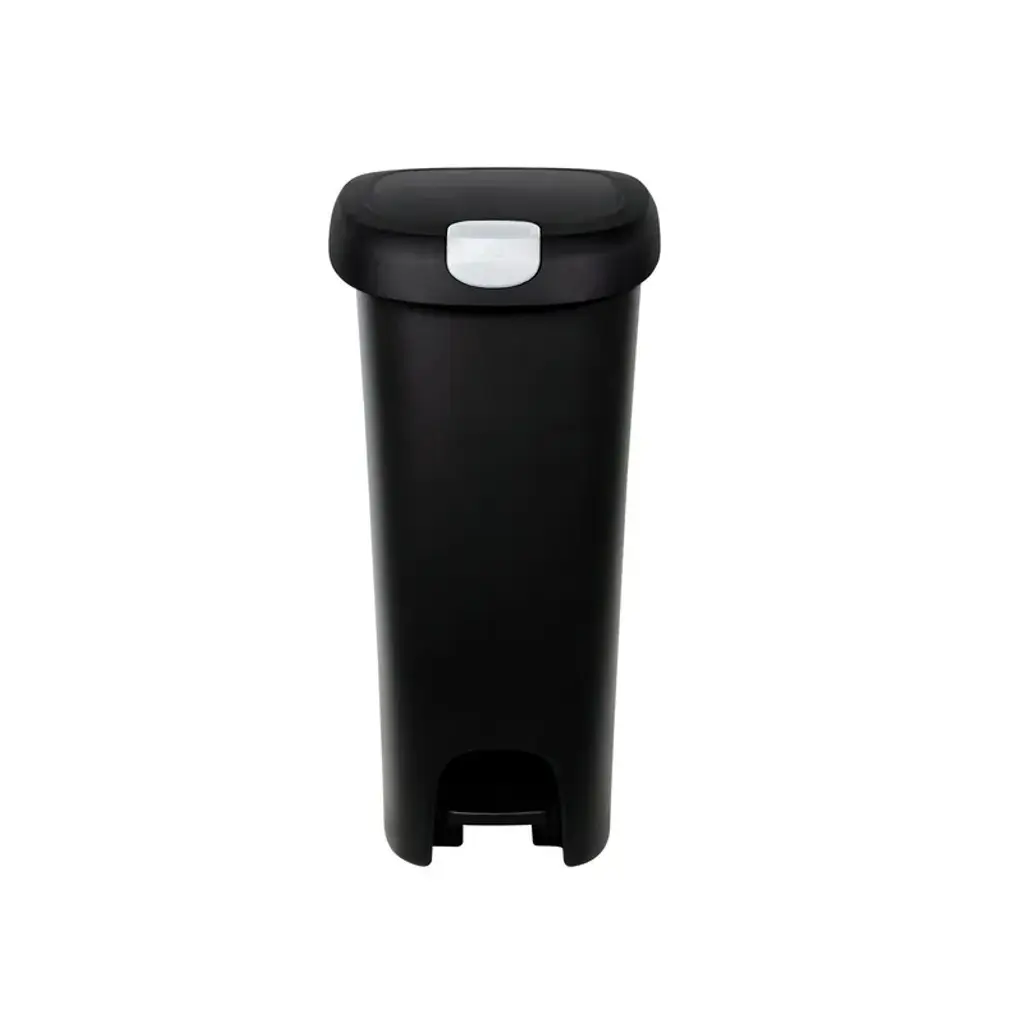 help keep curious pets and children out and easily avoid messes. The slim design in black with a 12-gallon capacity make this an ideal large kitchen trash can great for busy families who want to limit trips to take the garbage out. Use the step on pedal for easy, hands-free trash disposal. It also uses standard 13 gallon kitchen trash bag.