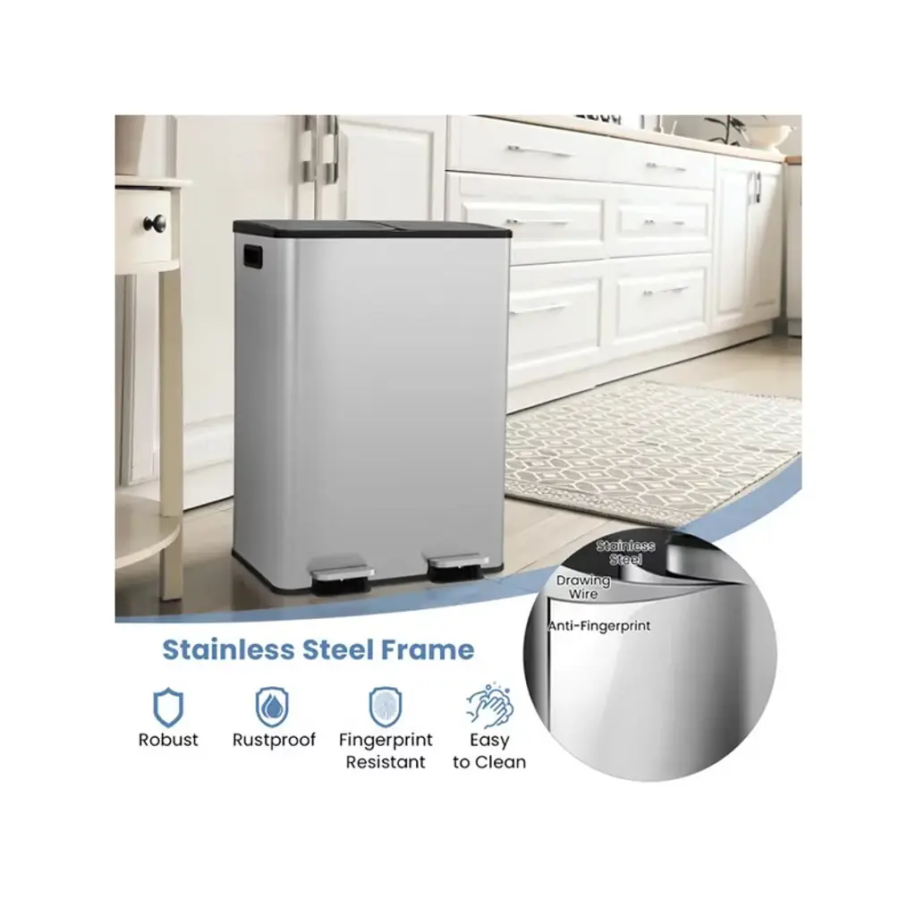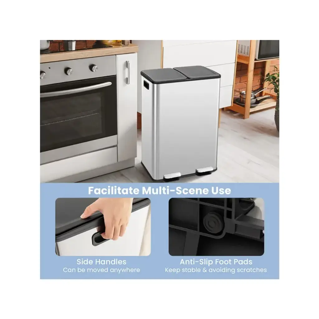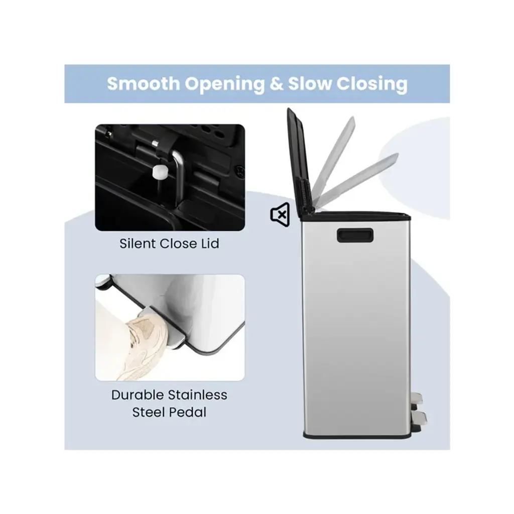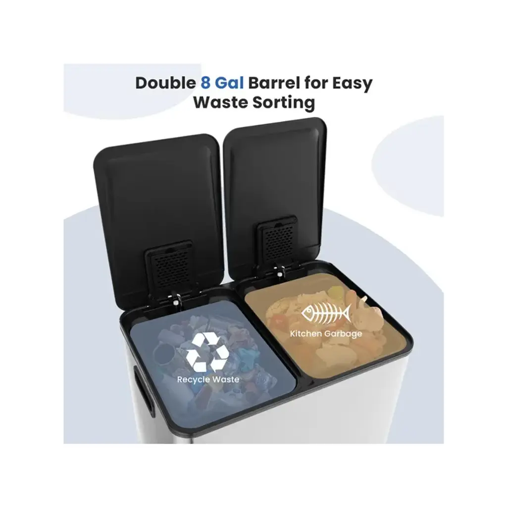 Racxily 2 X 8 Gal Dual Compartment Trash Can, Waste Basket, Garbage Can For Home, Kitchen, Silver