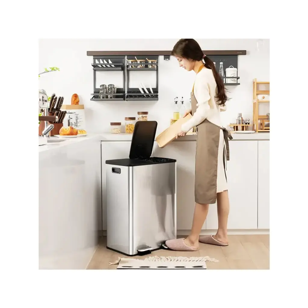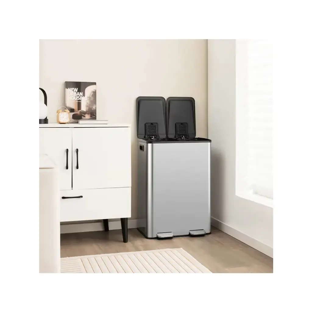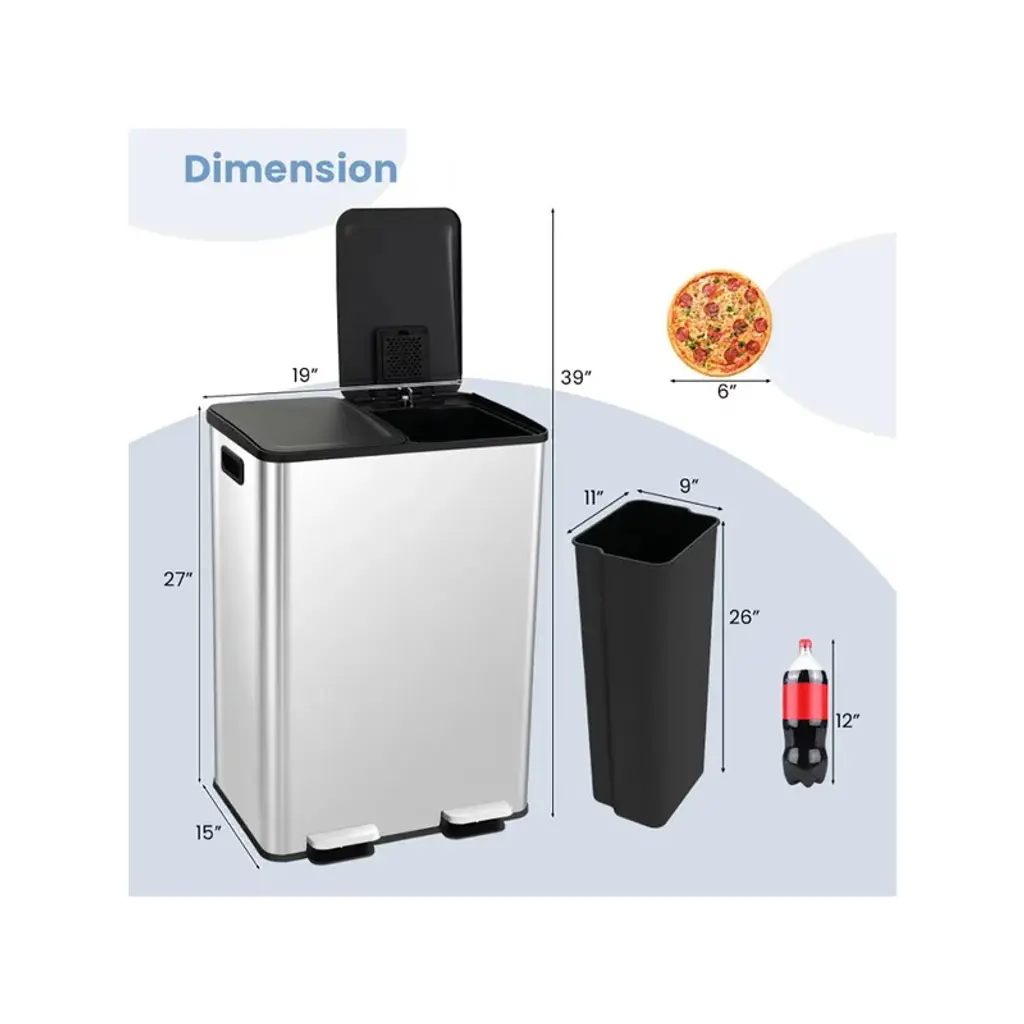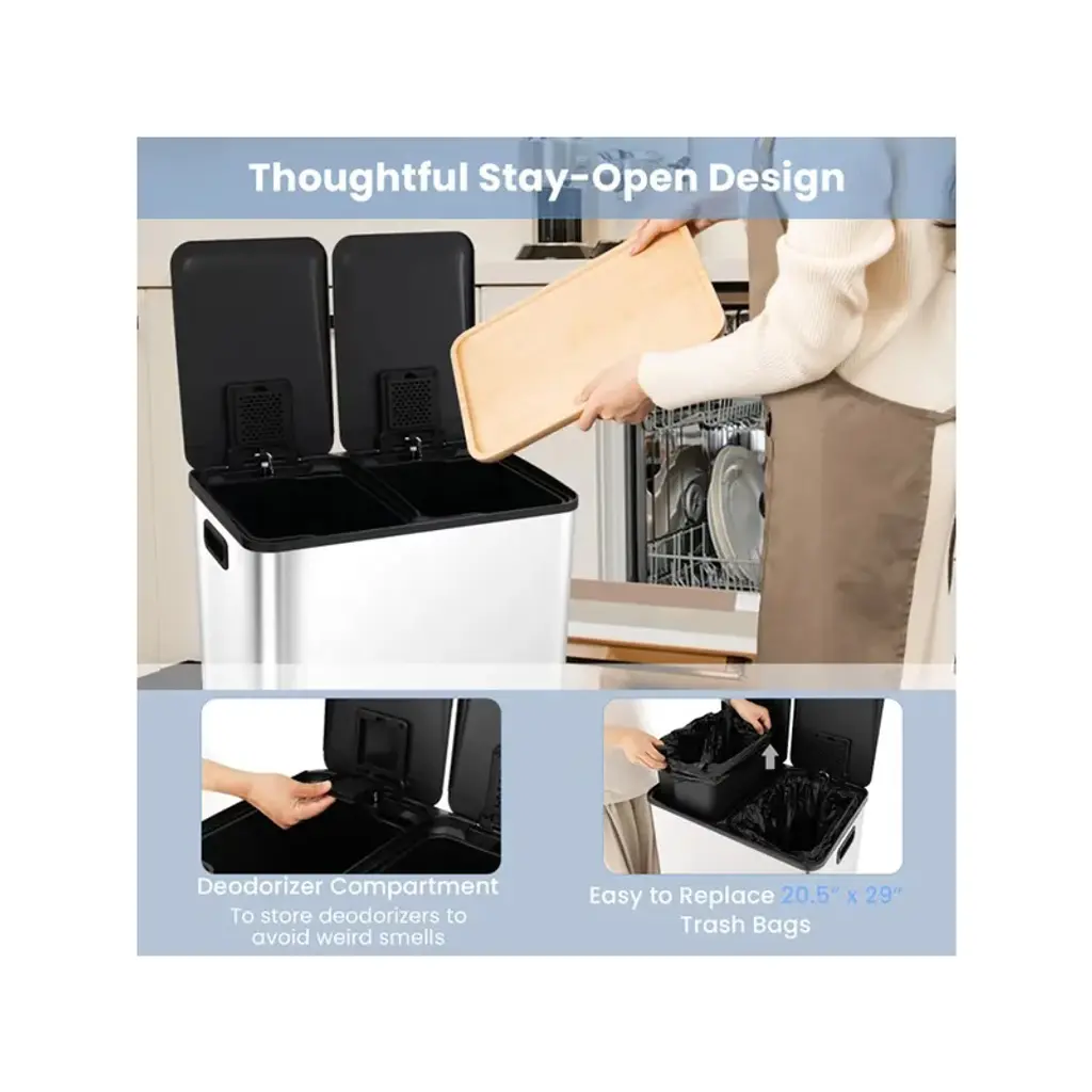 Double 8 gal/30 L barrel for easy waste sorting of recycled waste and kitchen garbage -Stainless steel frame is robust, rustproof, fingerprint resistant and easy to clean -Built with 3 layers, stainless steel layer, drawing wire layer and anti-fingerprint layer -Thoughtful stay-open design allows you to deal with long-time chores -Comes with smooth opening and slow closing to lower noises while using -Deodorizer compartment to store deodorizers to avoid weird smells -Facilitate multi-scene use, like office, kitchen, dining room, etc -Fitted with the durable stainless steel pedal for effortless controlling -Anti-slip foot pads will keep stable and avoid scratches -Can be moved anywhere for wide use, thanks to side handles -Needs no installation, can be used as long as you unpack it
