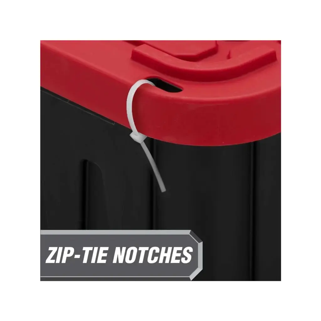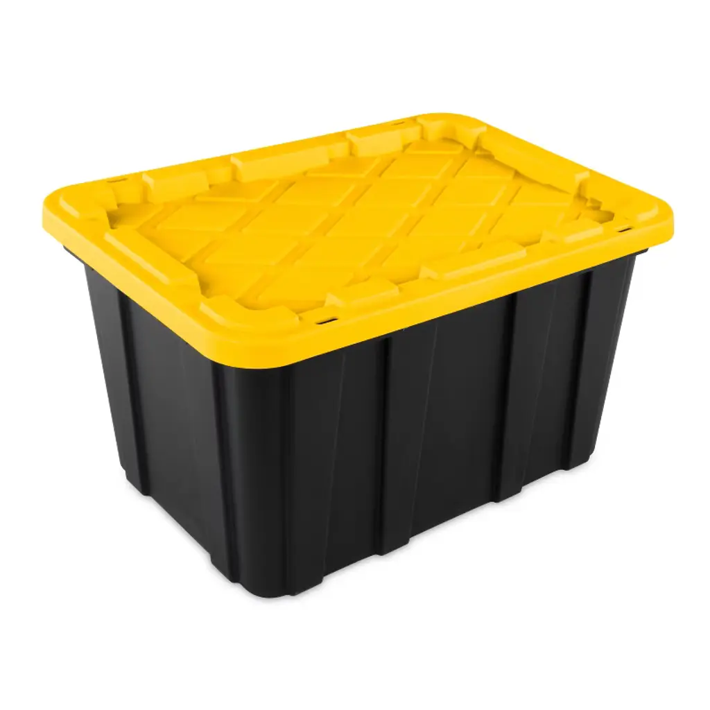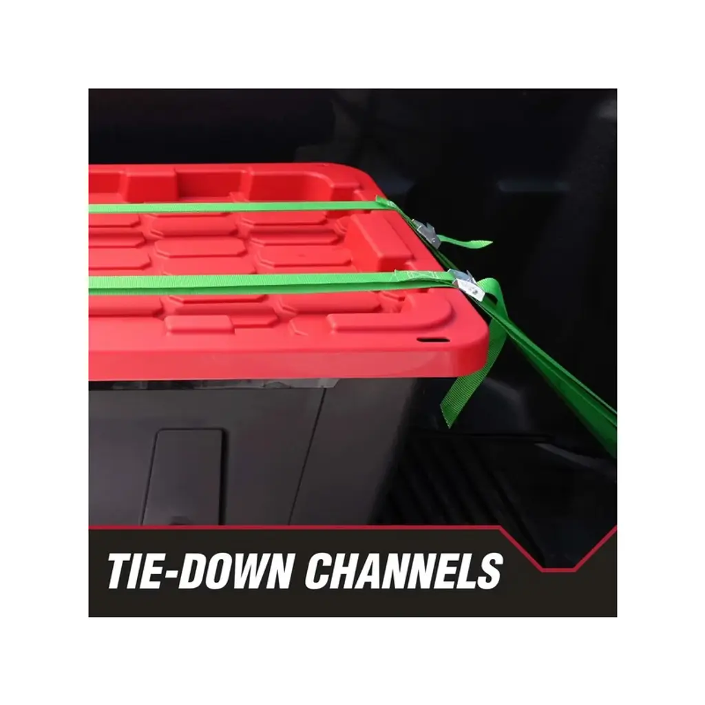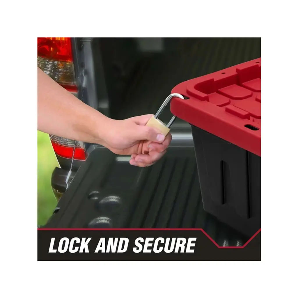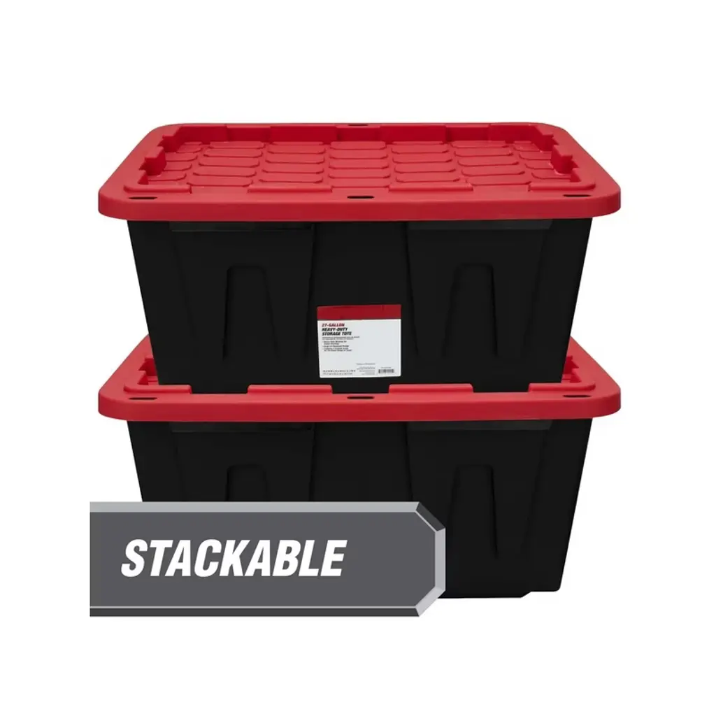 Large 27-Gallon Storage Bin 4-Pack (Black & Red) Heavy-Duty Organization Solution Maximize your storage space with this industrial-strength 4-pack of 27-gallon plastic storage bins! Designed for serious organization, each oversized container (30" L x 20" W x 14" H) features secure snap-on lids that protect belongings from dust, moisture, and pests. The reinforced plastic construction withstands heavy loads ¨C perfect for garage tools, seasonal decorations, warehouse inventory, or bulky sports equipment.