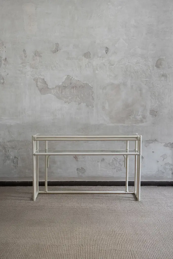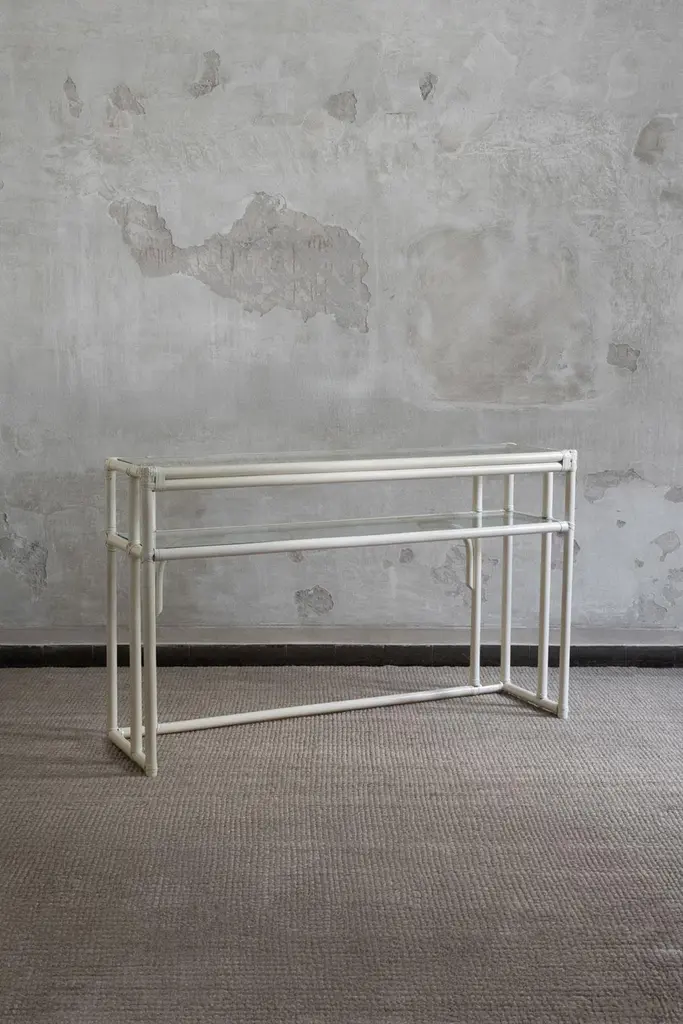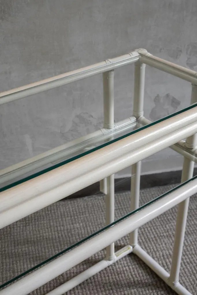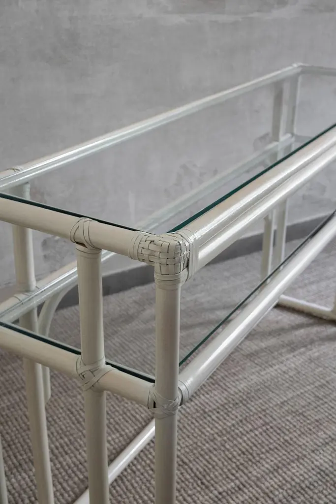 Rattan Console Table With Glass Shelves And Leather Bindings – Edizioni Molto