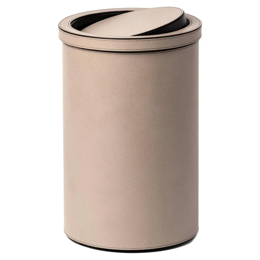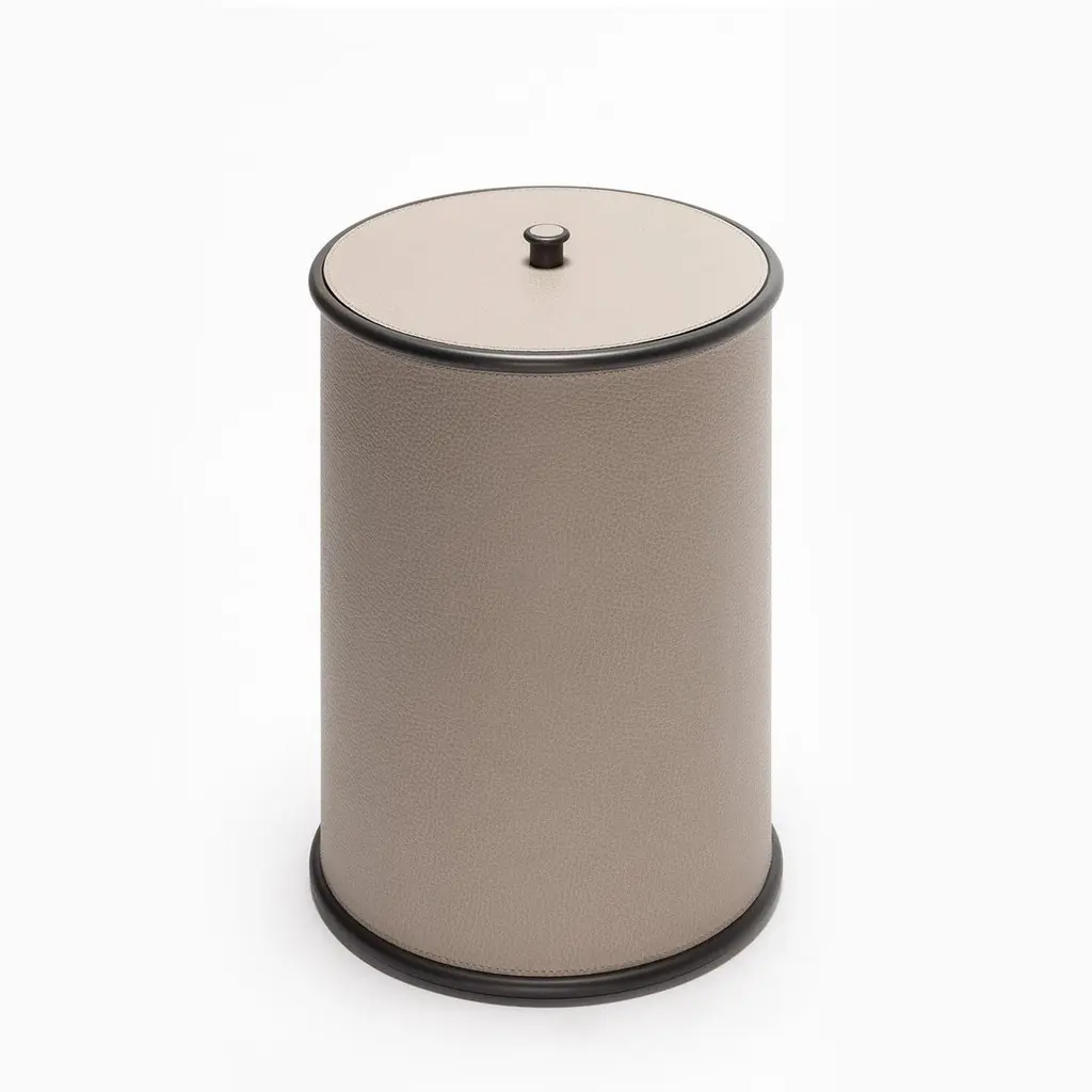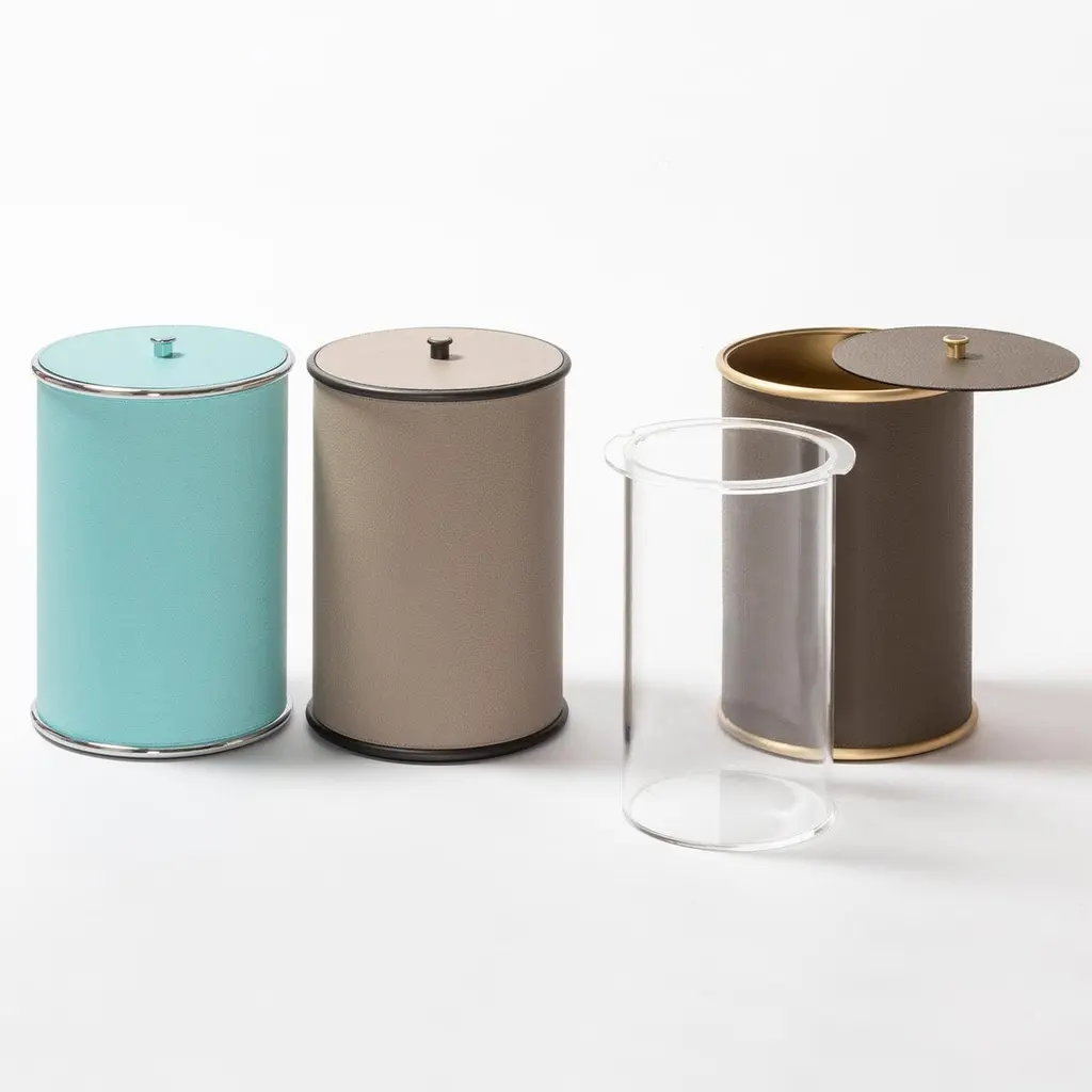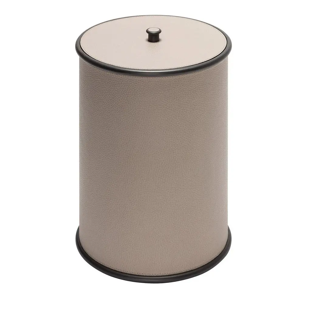 Ravello is a minimal bathroom collection ideal for any setting. The rigid cylindrical main volumes are rendered softer by the smooth decorative rounded edges, while the finest Italian leather, with its velvety texture, is combined with one among three finishes of choice for a naturally elegant resulting design. Partially leather-covered metal structure provided with removable inner plexiglass container. Non-slip waterproof rubber base underneath.