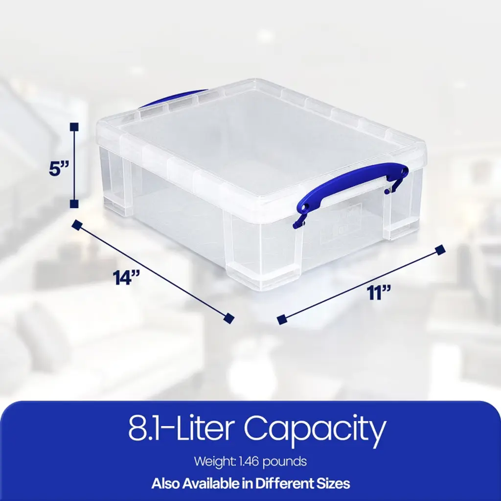Really Useful Box 8.1 Liter Plastic Stackable Storage Container Bin With Built-in Clip Lock Handles For Home Or Office Organization, 4 Pack, Clear