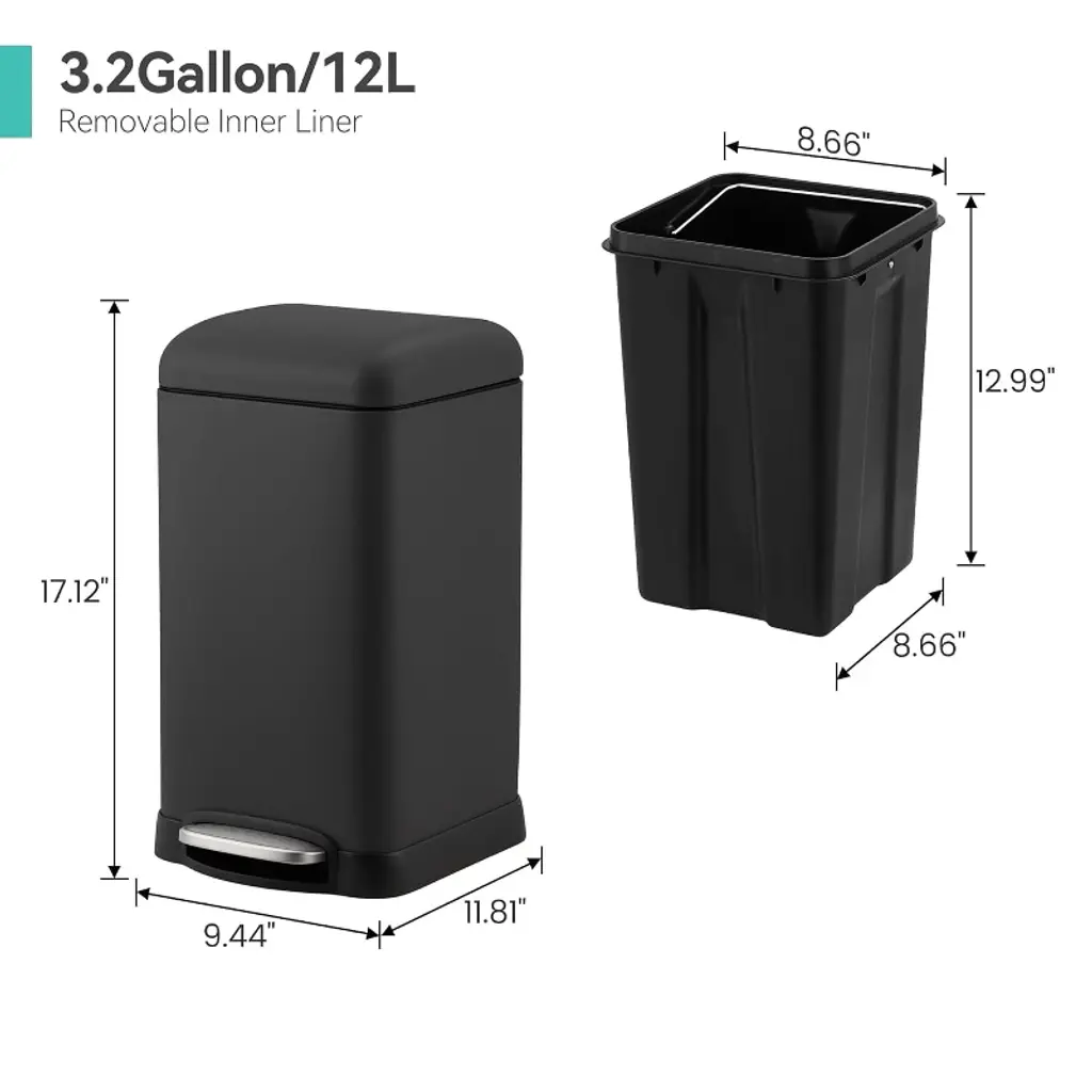 Rectangular Trash Can - 12L/3.2 Gallon Stainless Steel Kitchen Trash Can, Soft Close Lid Recycling Inner Bucket Fingerprint Finish Step-On Pedal, Garbage Bin for Bathroom Home