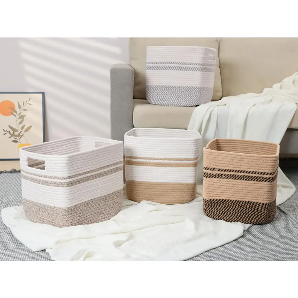 Minimalistic combined with a rustic style makes the whole flower basket simple and elegant. Easy to move and take away, this free awesome practical adorable storage bin is for daily use. These cotton rope baskets are designed to fit perfectly on shelves, closets, and even under beds, making them an ideal solution for organizing your home or office. The versatility of these baskets allows them to be used in various settings, whether in a living room, bedroom, or even a nursery. They can hold blankets, clothes, and other items, keeping your space tidy and organized. The neutral color of the cotton rope complements any decor style, adding a touch of elegance while being functional. This storage solution not only helps in decluttering but also enhances the aesthetic appeal of your home environment.