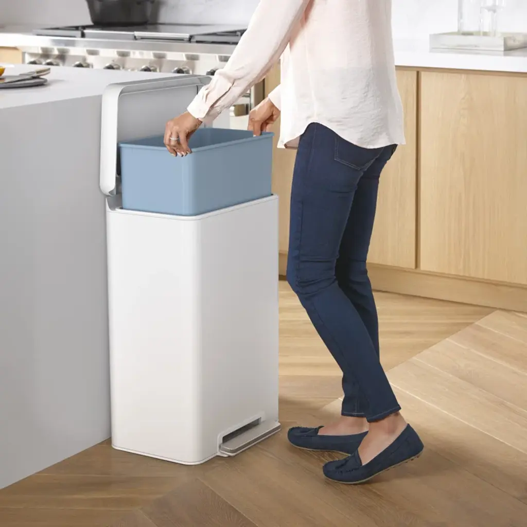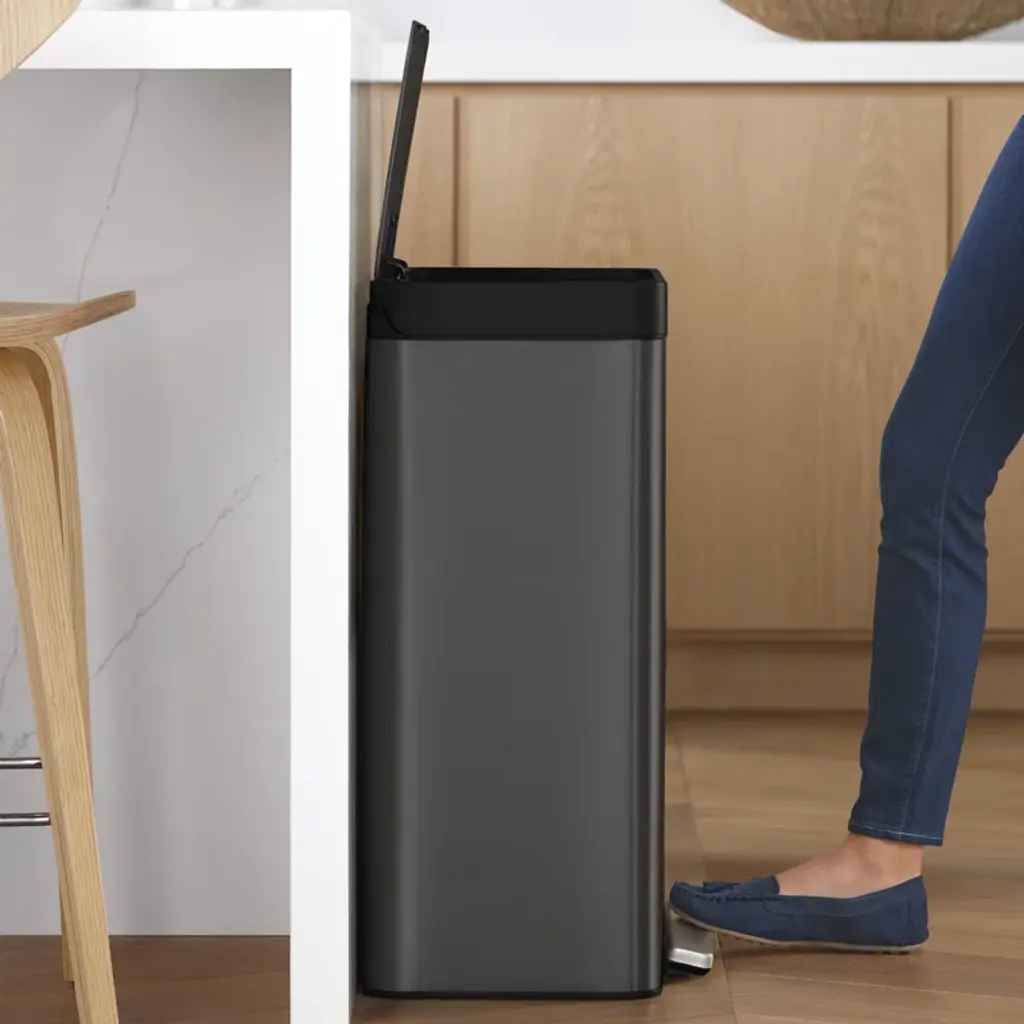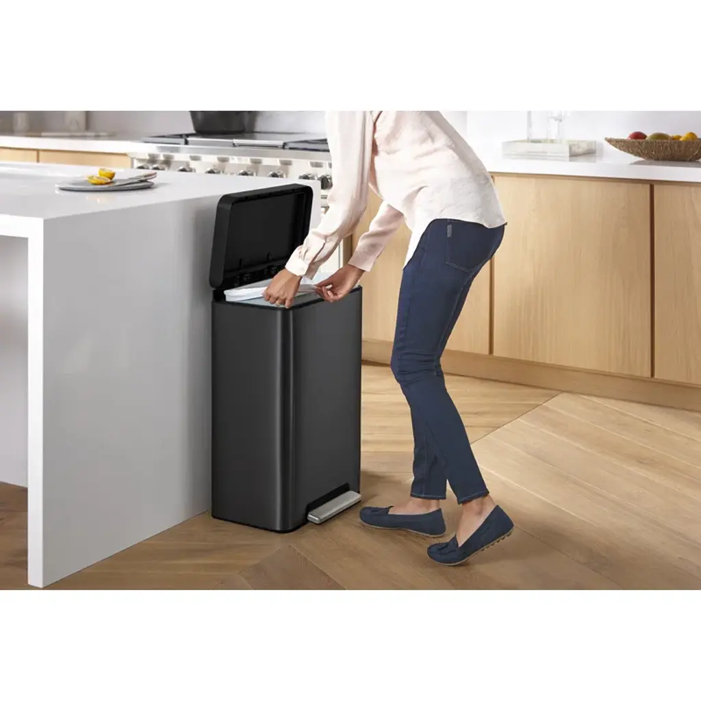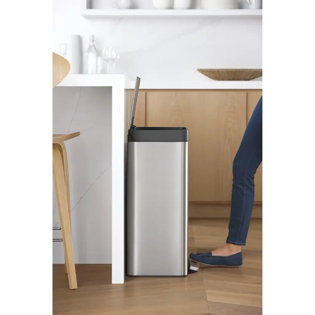 Crafted with thoughtful details and smart functionality, the Kohler step can collection will simplify your daily routine at home and meet the style demands of its surroundings. This 13-gallon rectangular step can have been designed to fit any brand of a 13-gallon trash bag. It opens with a sturdy foot pedal, allowing for hands-free operation. The trash can has an efficient footprint with clean lines and flush features, so it can be placed right against the wall or cabinet. A raised liner and rim-lock make bag changes easy, and the fingerprint-proof finish stays cleaner longer. For regular cleaning, use a damp microfiber cloth. Do not use cleaners or abrasives. To remove the sticker adhesive, use isopropyl (rubbing) alcohol.