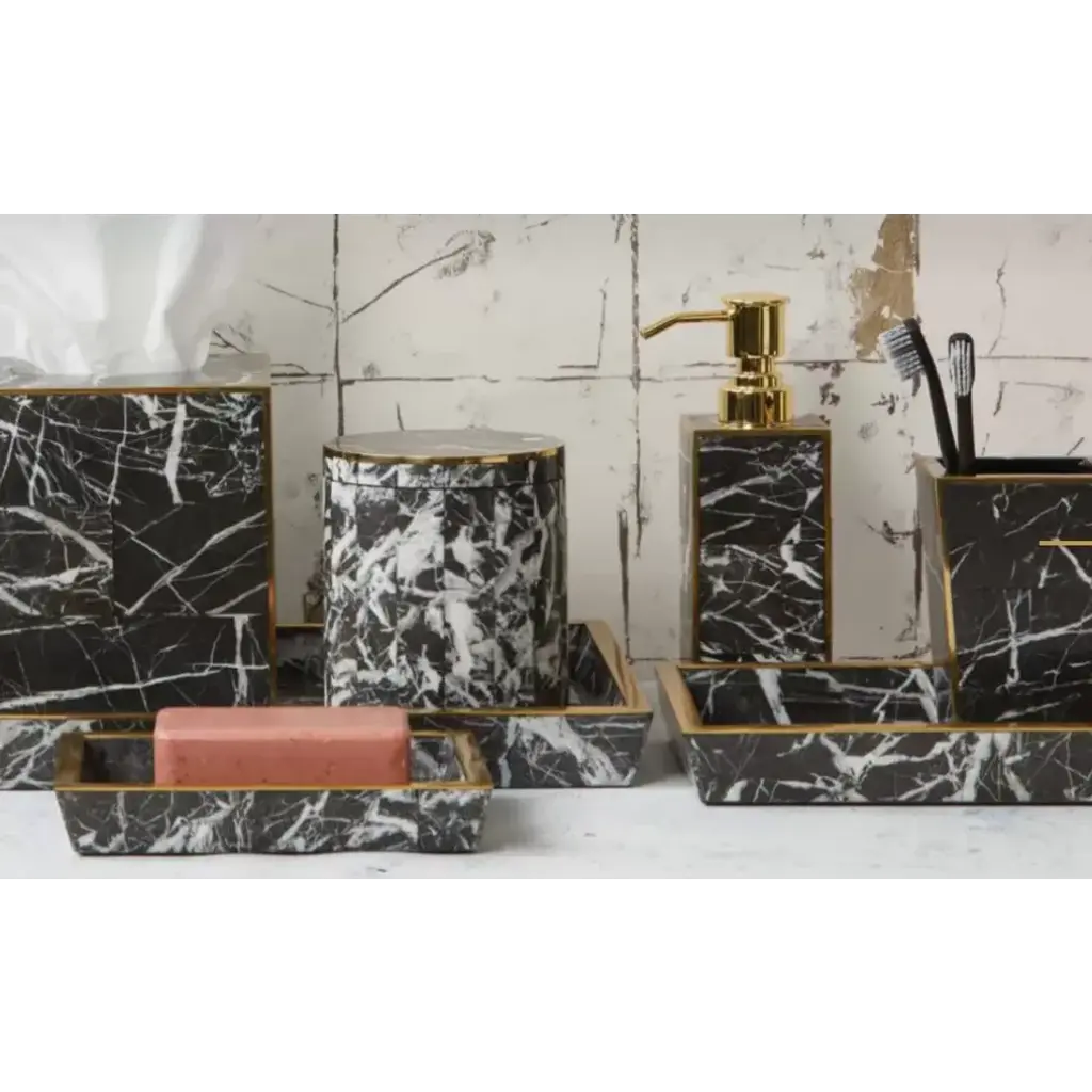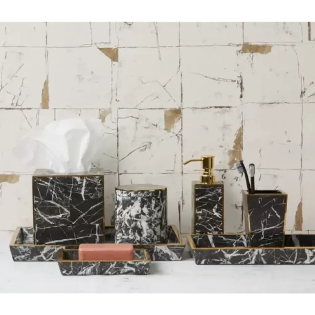 The beauty of this masculine, formal collection is in its black and white palette. The Rhodes’ Nero marble—a material that harkens to the ’30s—has gorgeous veining throughout; its thoughtful tiled placement creates distinctive abstract patterns. The designers at Pigeon & Poodle believe the details of a home are just as important as the furniture. A gorgeous toothbrush holder or handcrafted canister can elevate an entire bath, the perfect frame can heighten the feel of a whole space, and a good-looking storage basket can be your look’s missing link. With thoughtful design and top-notch craftsmanship, Pigeon & Poodle create home accessories with the care and attention typically reserved for larger pieces of décor.