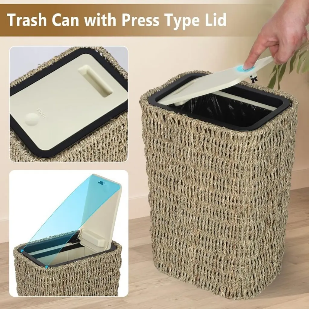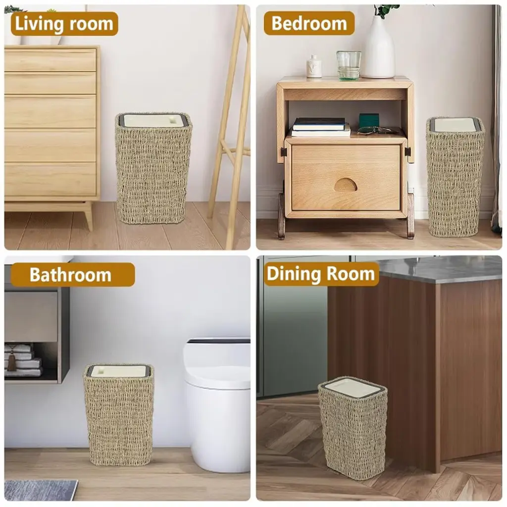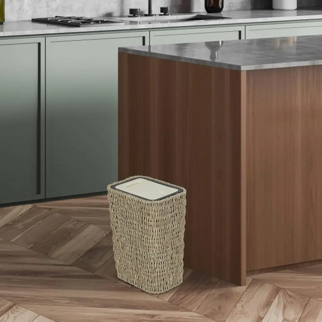 Risokeys 2.6gallon Small Rattan Trash Can With Press Top Lid,slim Wicker Waste Basket For Bathroom,kitchen,brown