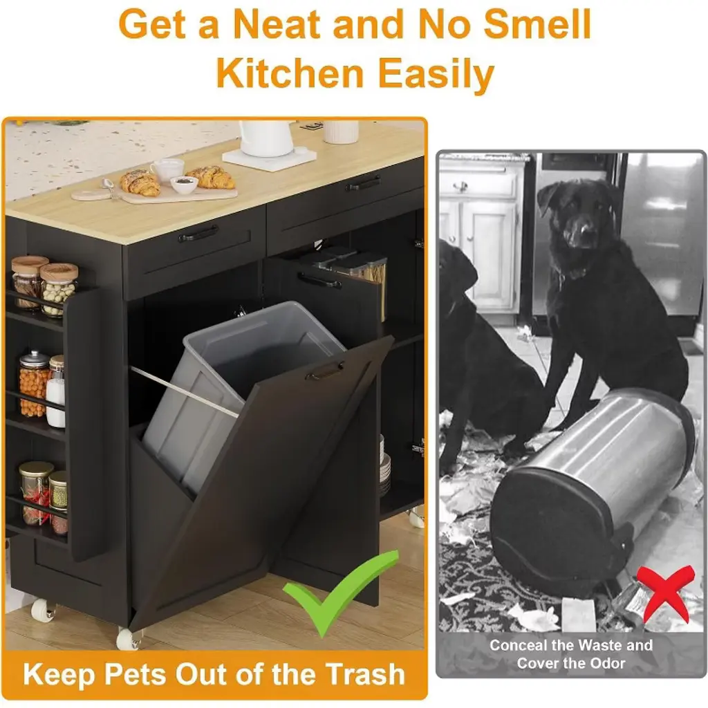 Rolling Kitchen Island Cart With Trash Can Storage, Drop Leaf & Power Outlet, Spice Rack, Knife Mobile Island Table For Kitchen