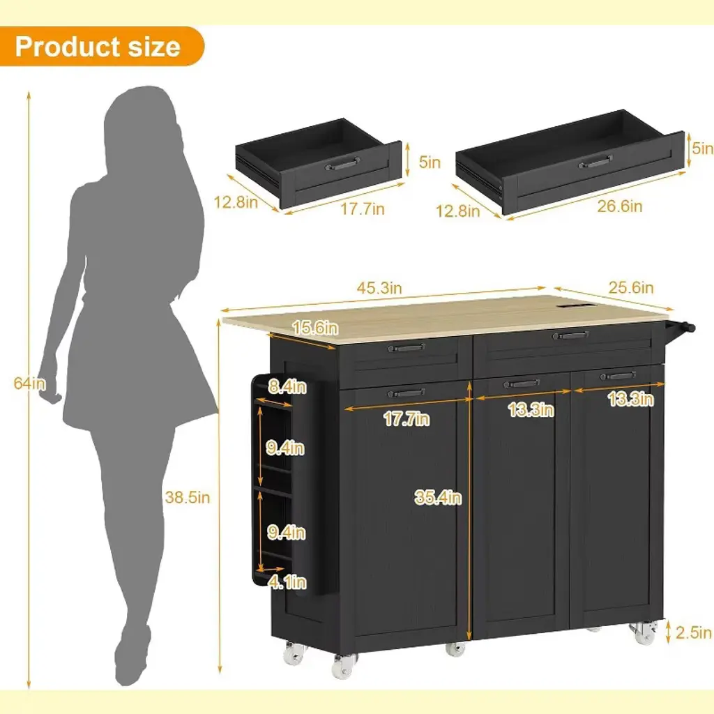 Rolling Kitchen Island Cart with Trash Can Storage ,Kitchen Island with Drop Leaf & Power Outlet , Kitchen Rolling Island with Spice Rack & Towel Rack, Holder, Knife Mobile Island Table for Kitchen, 45.3 inches countertop provides ample space for food preparation, and there are two large storage cabinets and two drawers to easily store your utensils, cookware, spices, towels, cutlery, and kitchen appliances.