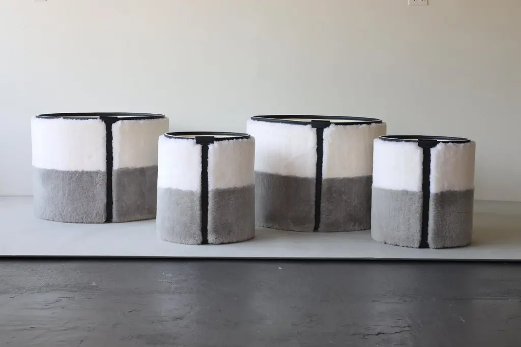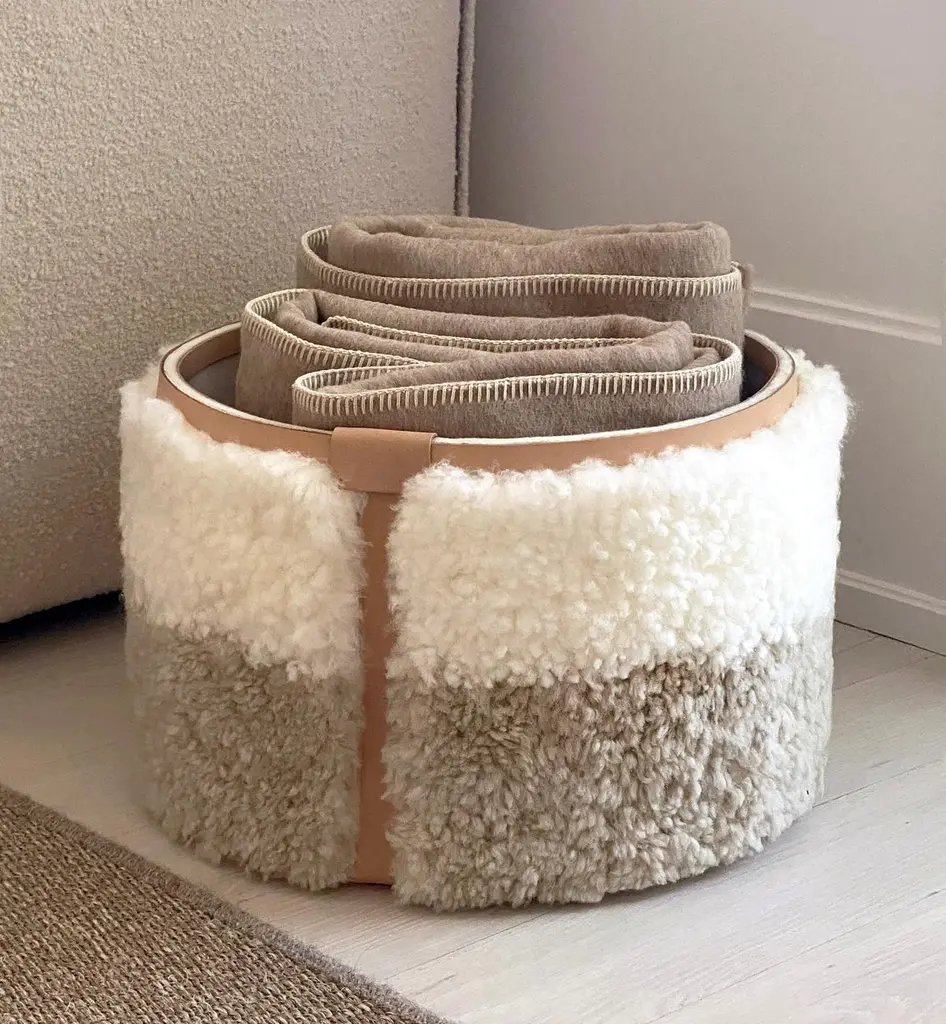 Storage can be luxurious! The Round Bin X is meticulously crafted to combine functionality with aesthetic appeal. The exterior is single or two-tones of plush or curly shearling with leather detailing and a subtle embossed logo that signifies its artisanal craftsmanship. Its rounded shape offers a spacious interior for storing blankets, magazines, or toys, ensuring both practicality and style. Versatile yet distinctive, placed in a living room or bedroom, it effortlessly elevates the space, adding a touch of artisanship and warmth with practicality in mind. Construction: Handcrafted to order in Long Island, NY. Description (in Primary Image): Curly Black Shearling (Top + Bottom), Black Ojai LeatherMaterials: 100% Wool Felt, Leather, Sheepskin WoolDimensions (in Primary Image): 17"Ø x 16"H - Also available in custom sizes.Production Time 6-8 weeks. Rush fee is an additional 25% of listed price.