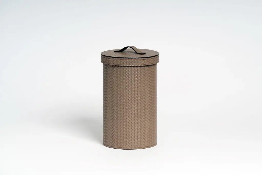 Nothing like a sleek waste bin in calfskin leather to keep your bathroom looking chic. The cylindrical body is entirely covered by hand with fine calfskin leather in a woven pattern. Imprinted by Maker