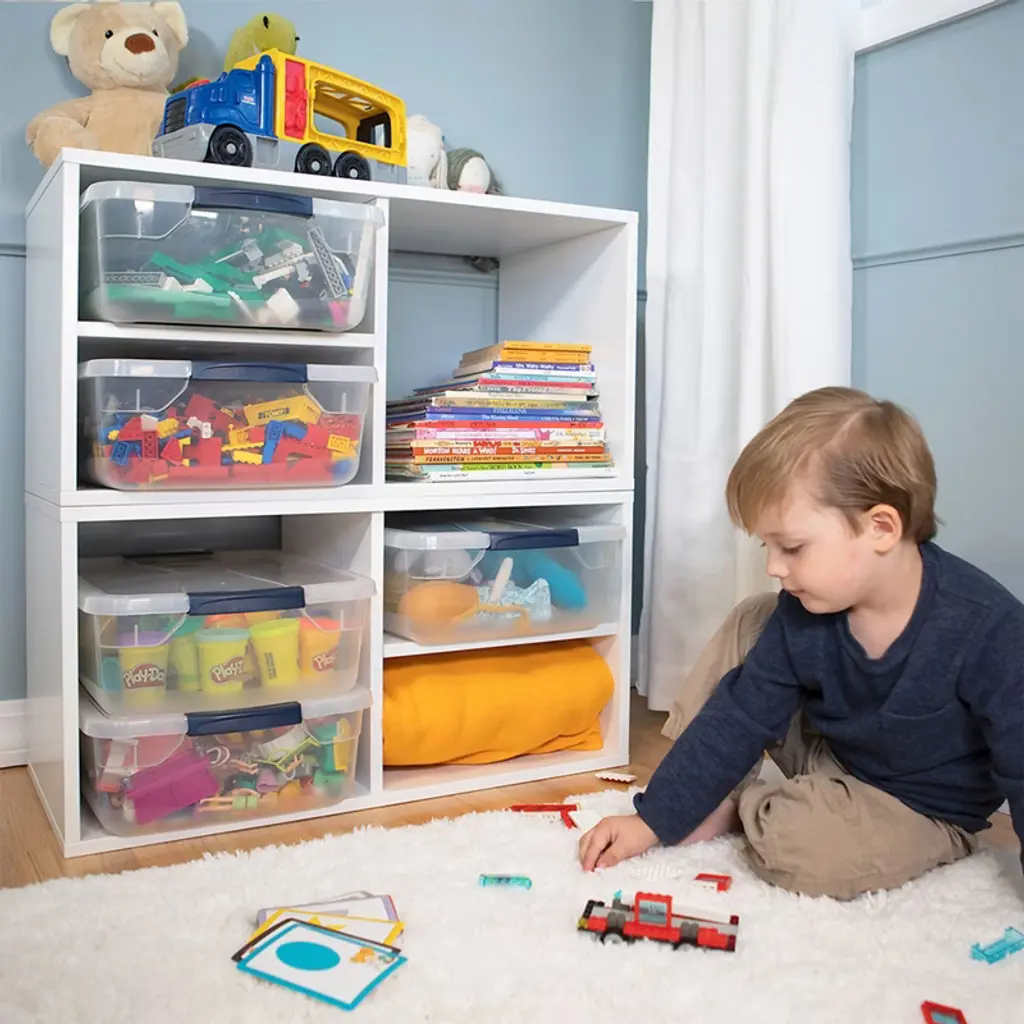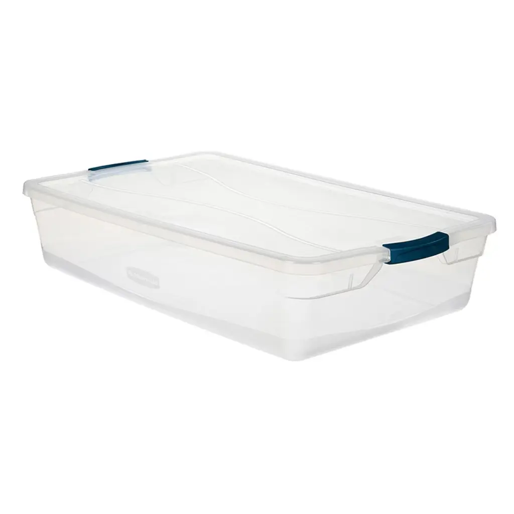 When clutter threatens to take over your space, reign it in with help from the 4-pack of Rubbermaid Cleverstore 42-Quart Plastic Storage Containers. This clear storage bin makes it easy to organize your things and see exactly where they are. This storage box overall measures 29.00 inches long and 17.75 inches wide. With a 42-quart capacity and a shallow 6-inch height, this storage container is great for storing small items. Papers, art supplies, kitchen spices, hats and gloves, toys, office supplies, and more will fit inside the latching tote. You can conveniently see what you stored in the bin thanks to the clear sides and see-through lid. This plastic storage container's lid makes for both easy transport and convenient storage. By simply snapping the latching lid into place, your valuable items stay safe inside the storage tote. The recessed design of the heavy-duty lid allows for effortlessly stacking storage bins in your closet, garage, or storeroom. This will help keep your space looking neat and tidy. Keep your items organized. With the 4-pack of Rubbermaid Cleverstore 42-Quart Plastic Storage Containers, there's a place for everything......
