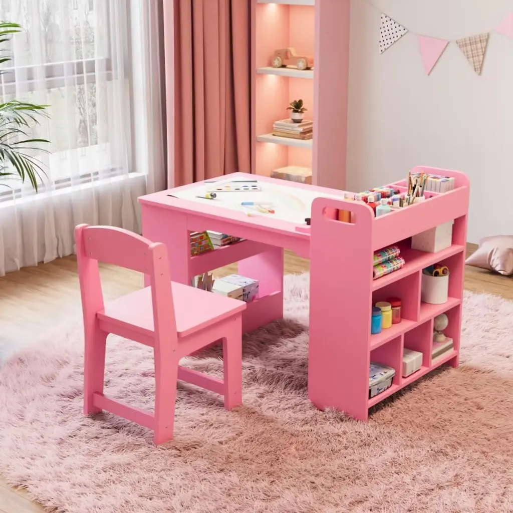 Multifunctional Sensory Table Set: Let the 32.1 x 23.6 x 19.9-inch kids play activity table with stools create a mini playground for your kids, encouraging them to explore, play, and learn through direct sensory experiences. It's an excellent partner for enhancing sensory development while also fostering fine motor skills, and cognitive abilities. Multi-Scenario Application: With 2 double-sided tabletops, our toddler sensory table with 2 chairs allows children to enjoy meals, draw, and engage in various activities. 2 folding storage bins can hold toys or art supplies, making it easy for kids to play with sand and water at home, while the paper roll holder enables easy access for kids to pull out drawing paper. Durable and Safe Construction: The tabletop and legs are made from natural pine wood, meticulously polished with no sharp corners or burrs, making it safe for your children. With 1-inch thickened tabletop combined with the MDF board, our sensory table for toddlers can support up to 66 lbs, ensuring long-lasting durability and reliability as your child grows and plays. Easy to Assemble and Maintain: This sensory play table requires no tools for assembly —just need to connect the legs. Equipped with 4 non-slip foot caps, it protects your floors from scratches and reduces the risk of accidental bumps. The smooth surface can be easily wiped clean with a damp cloth, allowing your children draw and create freely. Perfect Gift for Toddlers: Our sensory activity table set is an ideal gift for children, suitable for birthdays, Christmas, Thanksgiving, and other festive occasions. It caters to various activities, satisfying both learning and play needs. Its lightweight design allows easy indoor and outdoor mobility, allowing kids to pursue their favorite Package Content 1 x Sensory Table with Stool 2 x Double-Sided Table Tops 2 x Foldable Storage Bins 1 x Paper Roll Holder 4 x Non-Slip Feet Caps