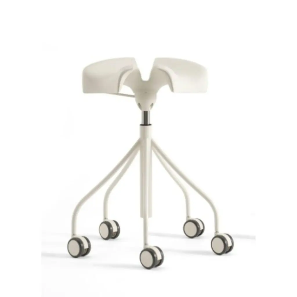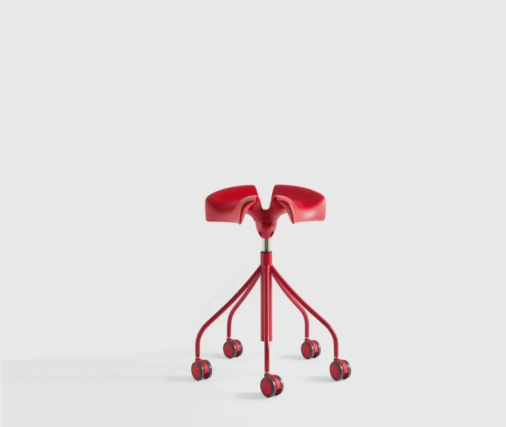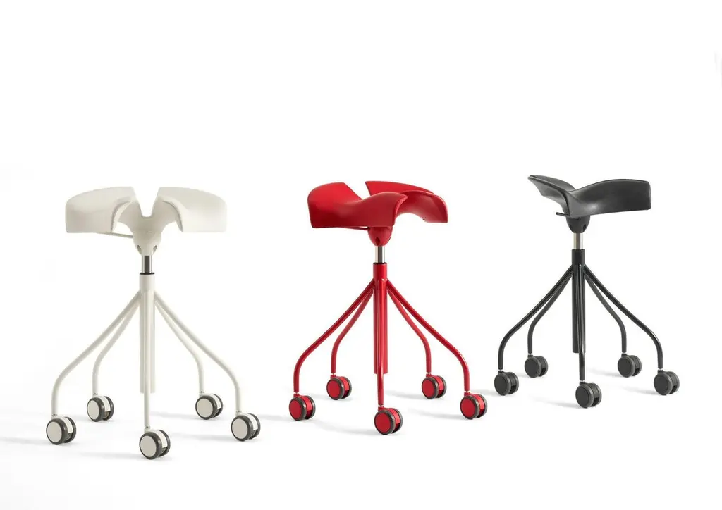 Set of Binaria stool by Otto Canalda & Jordi BadiaDimensions: diameter 65 x height 82 cm Materials: steel structure and lever painted in a polyester powder coating and satin finish. Available in White RAL 1013, Red RAL 3002, or Black RAL 9005. Integral polyurethane injected seat. Gas piston for height regulation (200mm) in a polished steel finish. Castors in a reinforced polyamide and rubber grey rings.Available in colors: black, red or white.Developed by a Dentist and an Industrial Designer to improve the ergonomics of certain professions, and has since been placed in an infinity of clinics, opticians, hairdressers, and laboratories. This stool has been an icon in Spanish design since the beginning of the 21st century.In 1972, a group of young architects and designers from Barcelona created BD with the aim of producing and marketing furniture and other objects for our projects, with complete creative freedom and with a criterion that has turned out to be quite different from the norm at companies in the sector, regarding both the shape and function.