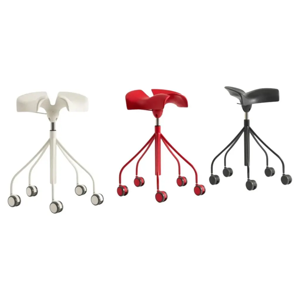 Stool designed by Jordi Badia and Otto Canalda.Manufactured by BD Barcelona Design.Steel structure and lever painted in a polyester powder coating and satin finish. Available in white RAL 1013, red RAL 3002 or black RAL 9005. Integral polyurethane injected seat.Gas piston for height regulation (200mm) in a polished steel finish. Castors are of a reinforced polyamide and a rubber grey ring.Measures: 61.5 cm D x 61.5 cm W x 62/82 cm H.