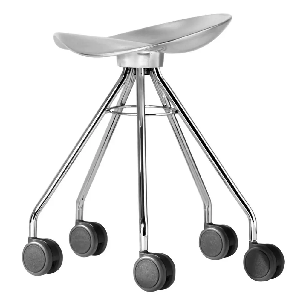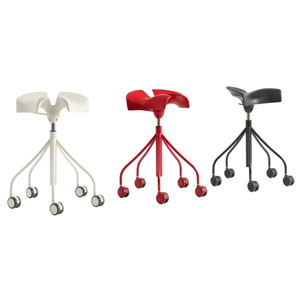 Stool designed by Jordi Badia and Otto Canalda.Manufactured by BD Barcelona Design.Steel structure and lever painted in a polyester powder coating and satin finish. Available in white RAL 1013, red RAL 3002 or black RAL 9005. Integral polyurethane injected seat.Gas piston for height regulation (200mm) in a polished steel finish. Castors are of a reinforced polyamide and a rubber grey ring.Measures: 61.5 cm D x 61.5 cm W x 62/82 cm H.