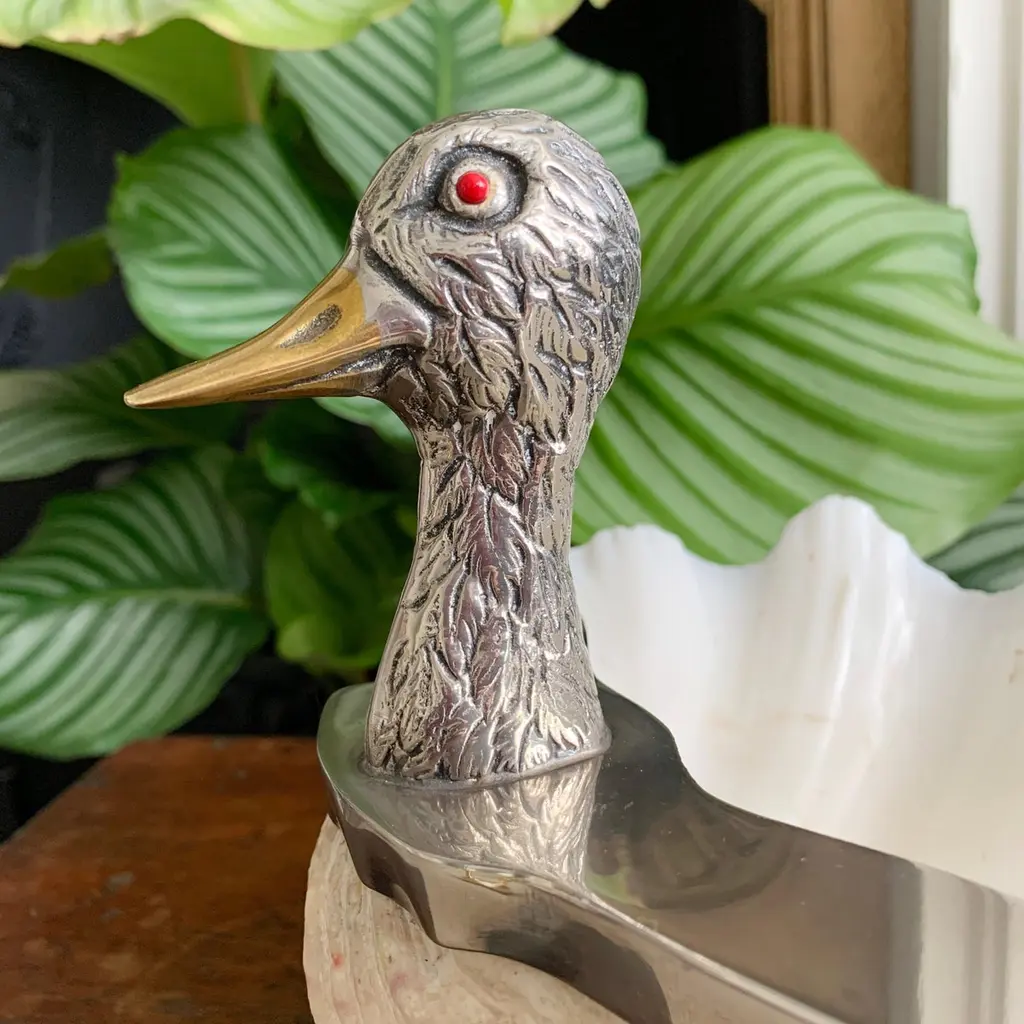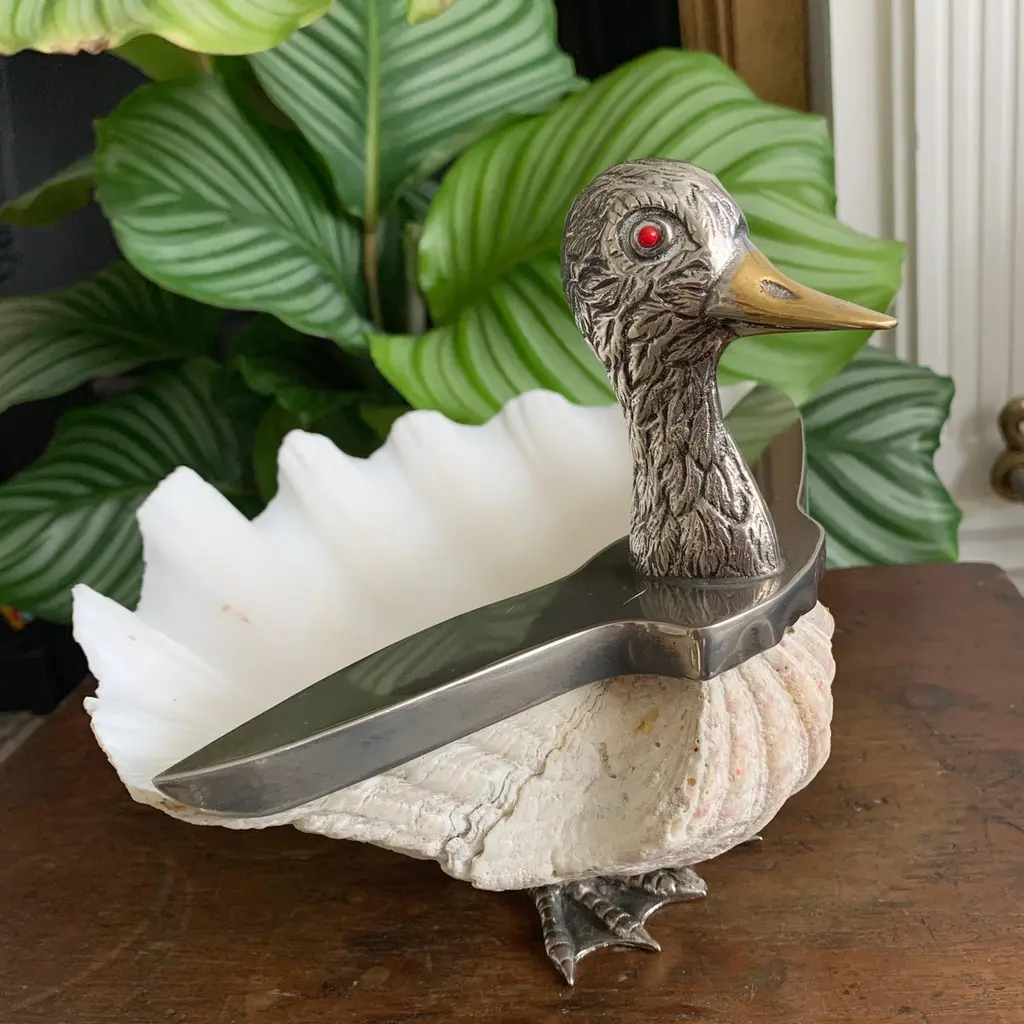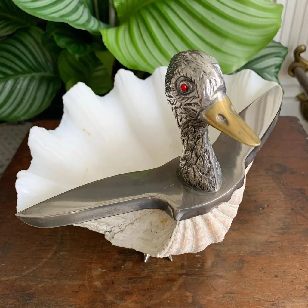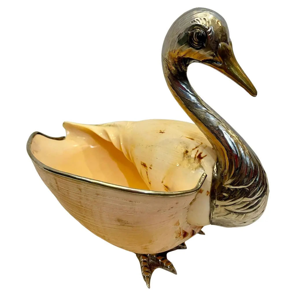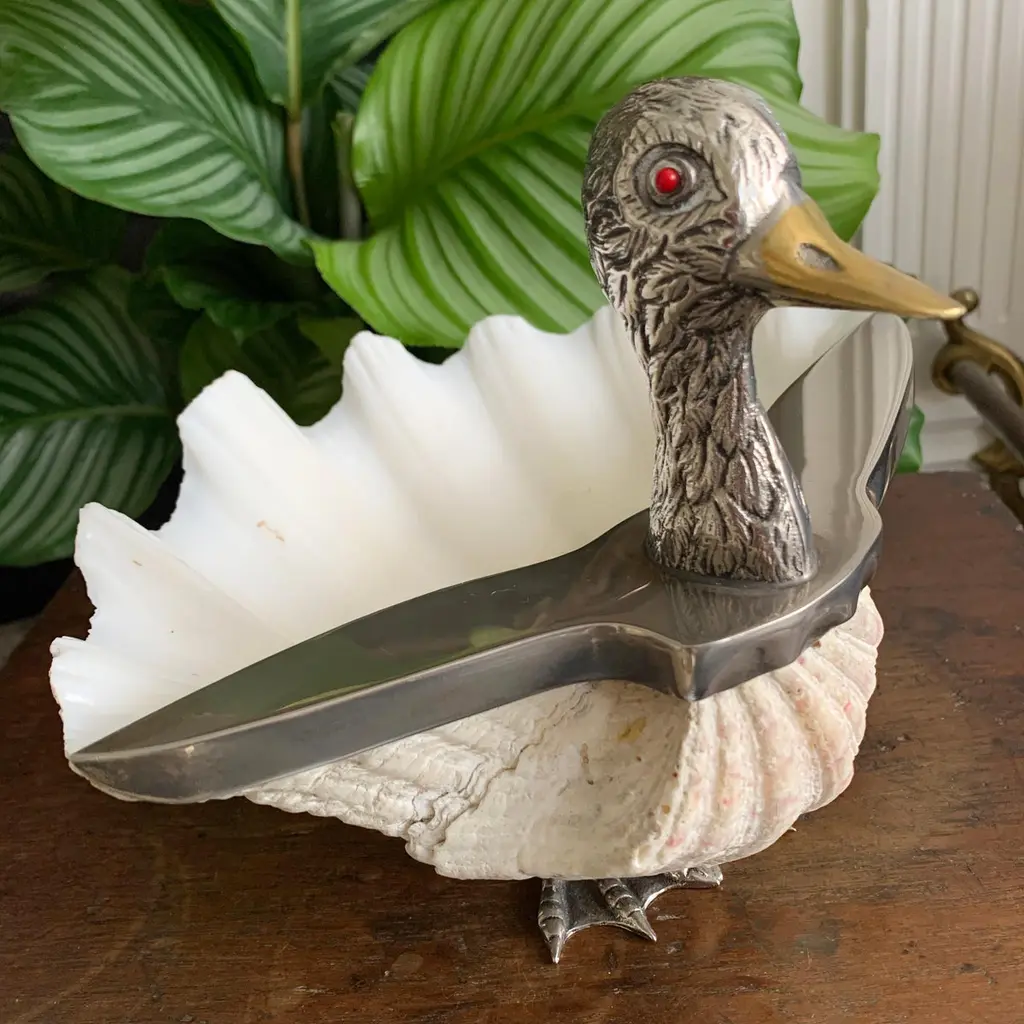 This beautiful clam shell duck designed and made by Gabriella Binazzi, Italy circa 1970s. The natural shell is mounted on a silver plated pair of feet and decorated with a fantastical silver plated duck head and shoulders. Signed and stamped near the feet. A fantastic rare piece.27cm width, 22cm depth, 19cm height.