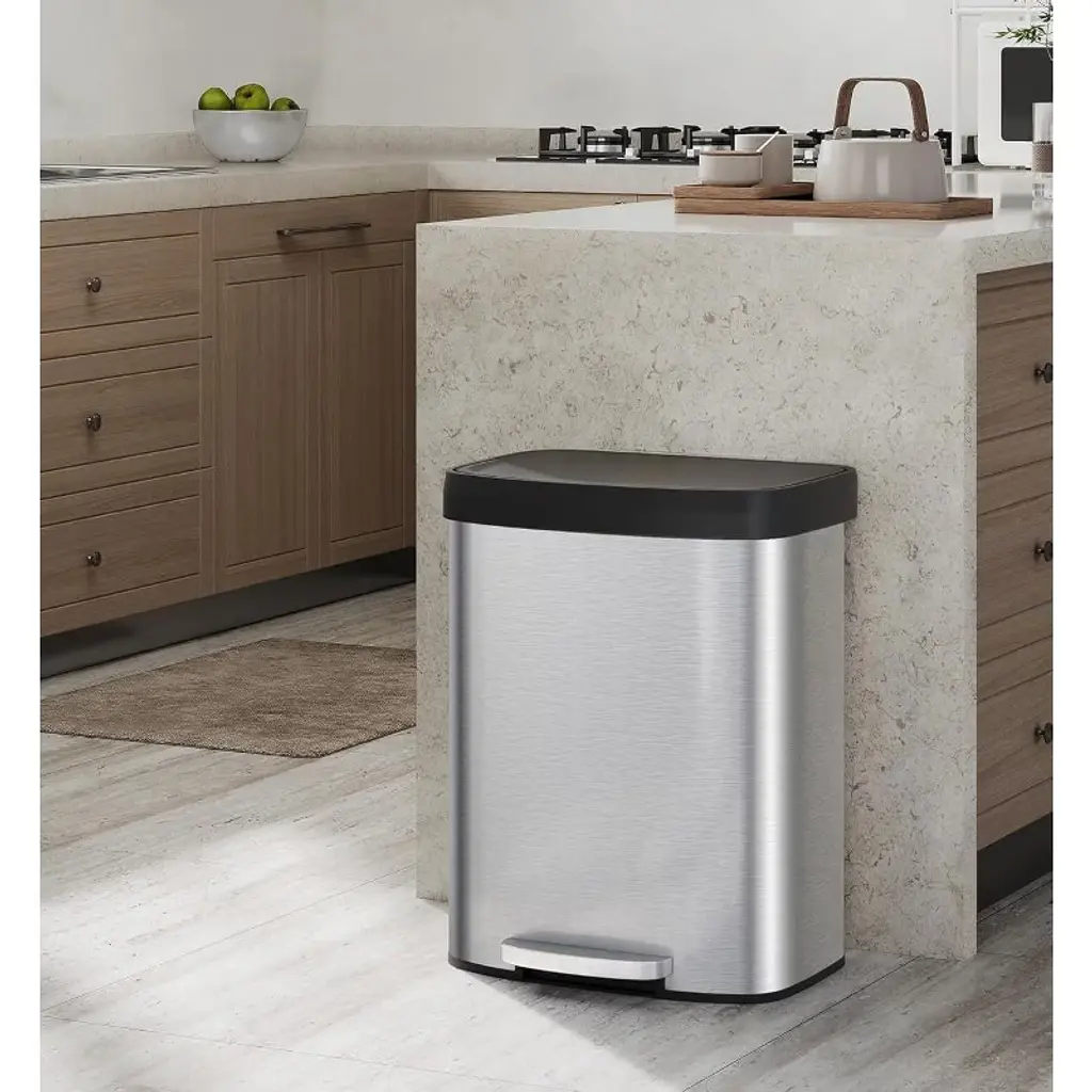 An innovative butterfly lid design opens from the center for maximum clearance under low countertops. The slim, space-efficient shape makes the most of tight spaces. Its strong steel pedal and our patented lid shox technology ensure the trash can will function smoothly and quietly for years. The trash can's stainless steel surface is protected by an invisible silver-ion coating that resists fingerprints and germs. Our Code L custom fit liner fits this kitchen trash can perfectly — no bunching or slipping for a cleaner trash experience.