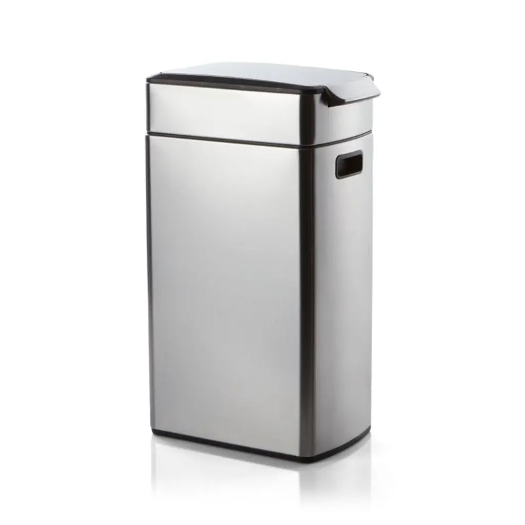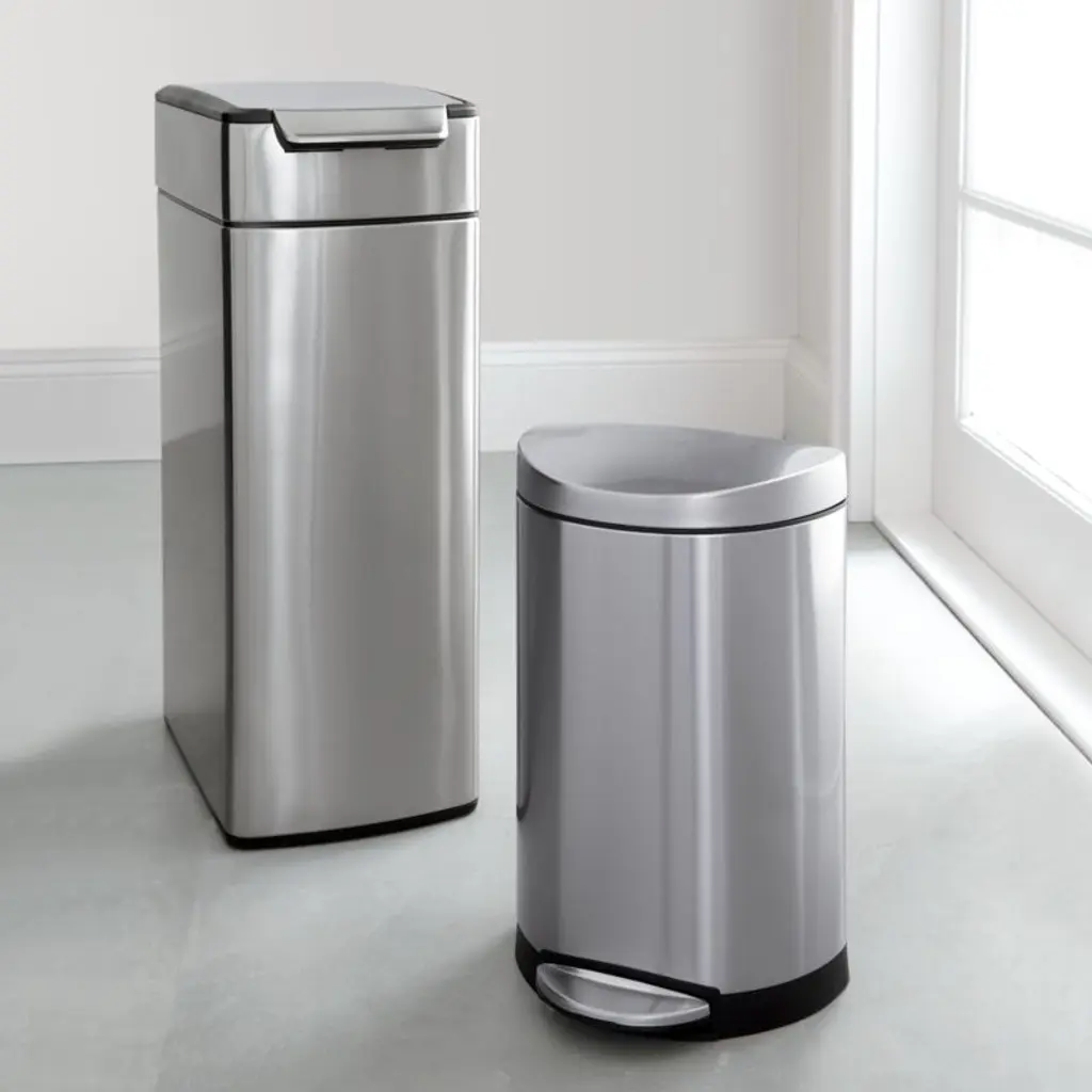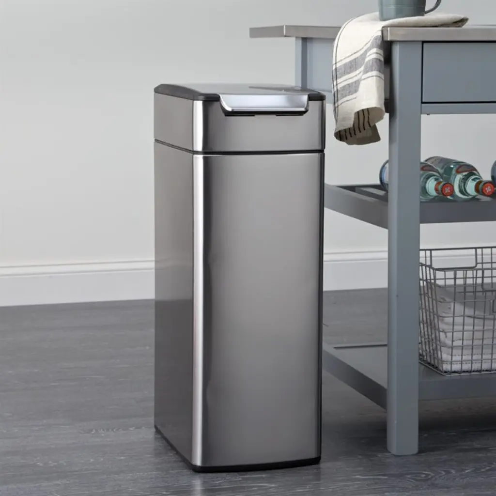 Fingerprint-proof, stainless-steel can with a slim, space-saving design features a unique touch-bar system that opens easily from any angle with a simple nudge or tap with your elbow, hip or knee. The lid remains open at your discretion, making it convenient for food prep and plate scraping. The sleek, specially designed hinge moves out of the way for the widest possible opening. Lid lifts off easily for a quick bag change. Protective nylon discs on the base prevent scratching floor surfaces.View all simplehuman products
