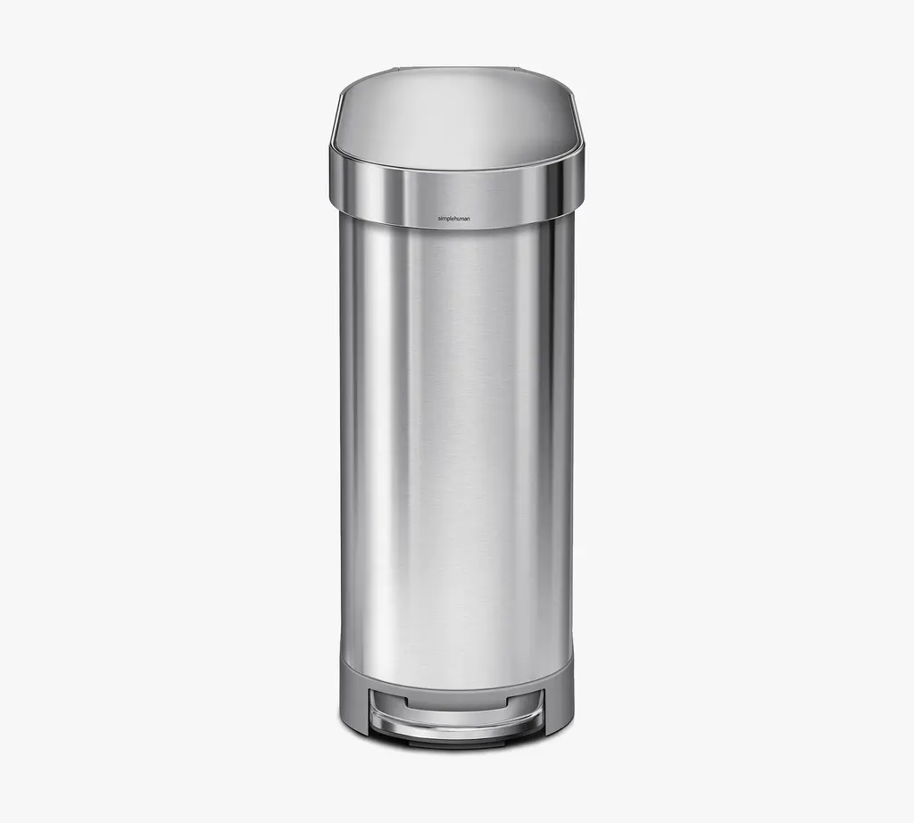 With its svelte, space-efficient form, this trash can is designed to fit easily into tight spots. Crafted of sleek stainless steel with a silver-ion coating that resists fingerprints and germs, it features a strong, silent-close pedal engineered to last more than 150,000 steps. The rim flips up for a quick liner change, then closes to grip and keep it neatly out of sight.