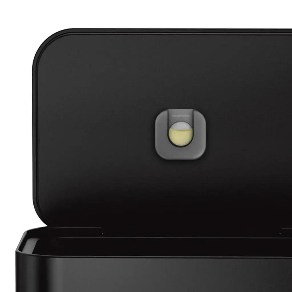 Finished in modern matte black, this breakthrough trash can from simplehuman features an innovative, integrated drip guard that eliminates the need for an inner bucket. An interior pocket stores and dispenses liners one at a time, speeding up change time and increasing trash capacity by 25%. Inside the rectangular step can, a stainless steel rim grips the liner to keep unsightly edges concealed. The durable, extra-wide steel step pedal is engineered to last 150,000 steps (that's more than 20 steps a day for 20 years). Patented lid shox technology ensures a smooth, silent close every time, while an internal hinge prevents the lid from bumping the wall. Liner refill packs slip easily into the back of the built-in liner pocket.View all simplehuman products