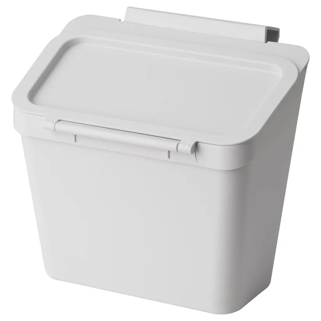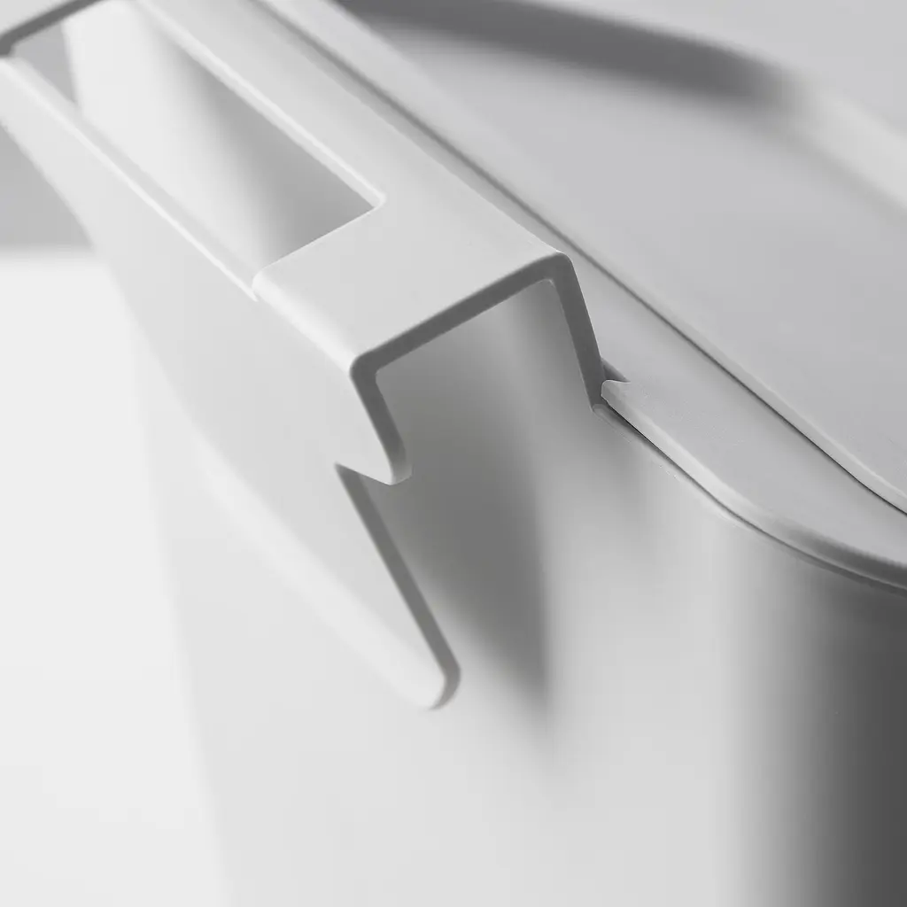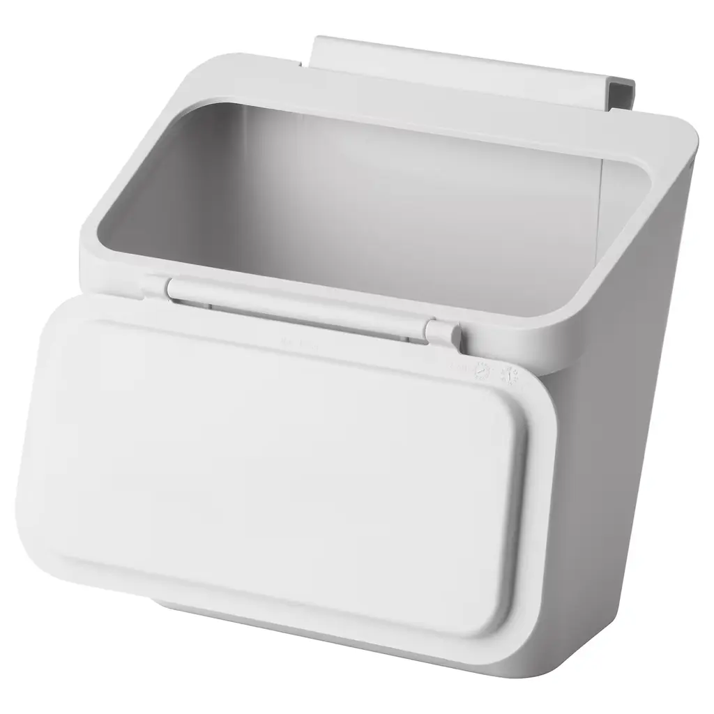 SKOLÄST Trash can for cabinet with door - light gray. With this trash can hanging over a door by the sink, you can easily dispose of waste when cooking or cleaning the sink bowl – without having to bend over. So small and compact that you can also place the trash can directly on the kitchen counter.