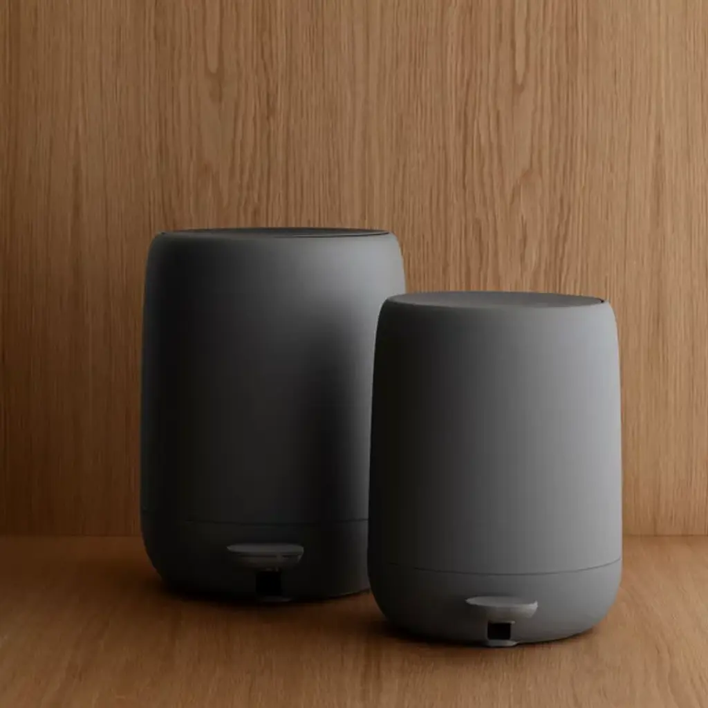 Keeping clean is a breeze with the Sono Pedal Bin Wastepaper Basket from Blomus. A cylindrical assembly of plastic and silicone, it’s rounded and soft, with a smooth lid set into the basket’s top that rises at the press of a pedal, dropping softly to cover a plastic bucket that’s removable for easy cleaning.