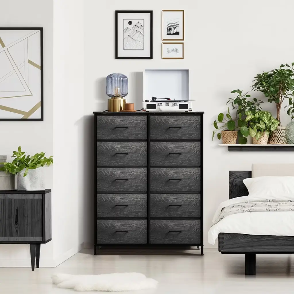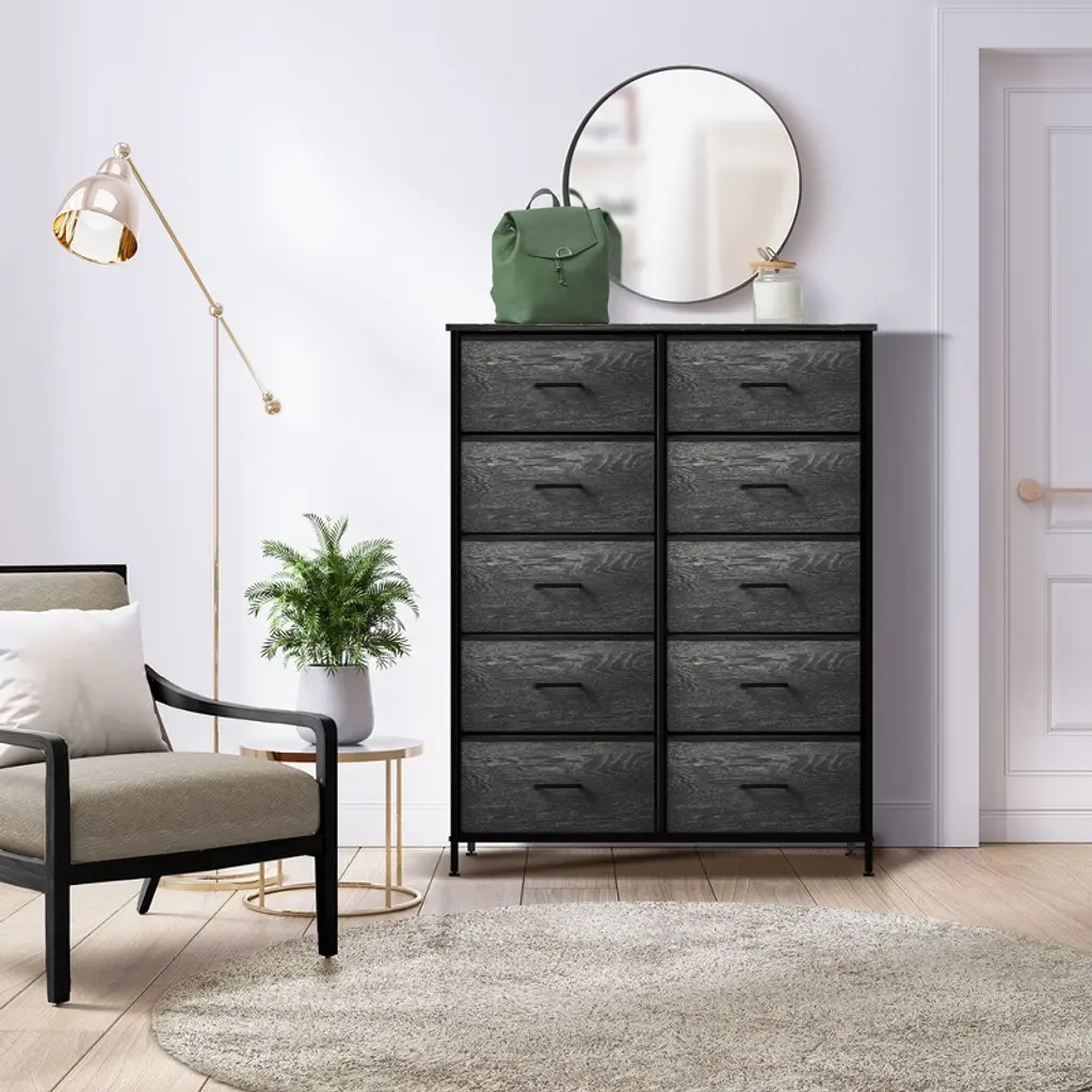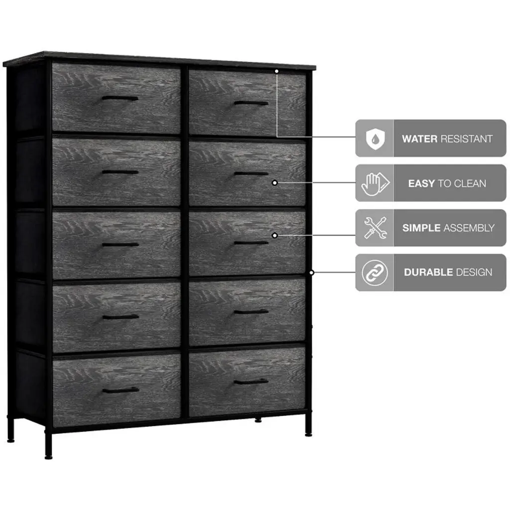 Keep your household clutter neatly tucked away in the Sorbus Portable & Tall 10-Drawer Fabric Dresser for Clothes. The lightweight design allows for effortless transport and reorganization. This chest of drawers features removable fabric drawer shelves that are great for storing clothing, toys, accessories, and any other items that are making a mess. Place this Sorbus dresser in a closet, next to your bed, use it as a tv stand, or add storage to a home office; the opportunities for organization are endless. When not in use, the fabric drawers can fold flat. For added convenience, these drawers wipe clean. This dresser is the perfect blend of rustic and modern design, featuring faux wooden fabric cubbies and contemporary black accessories. Getting organized has never looked better!