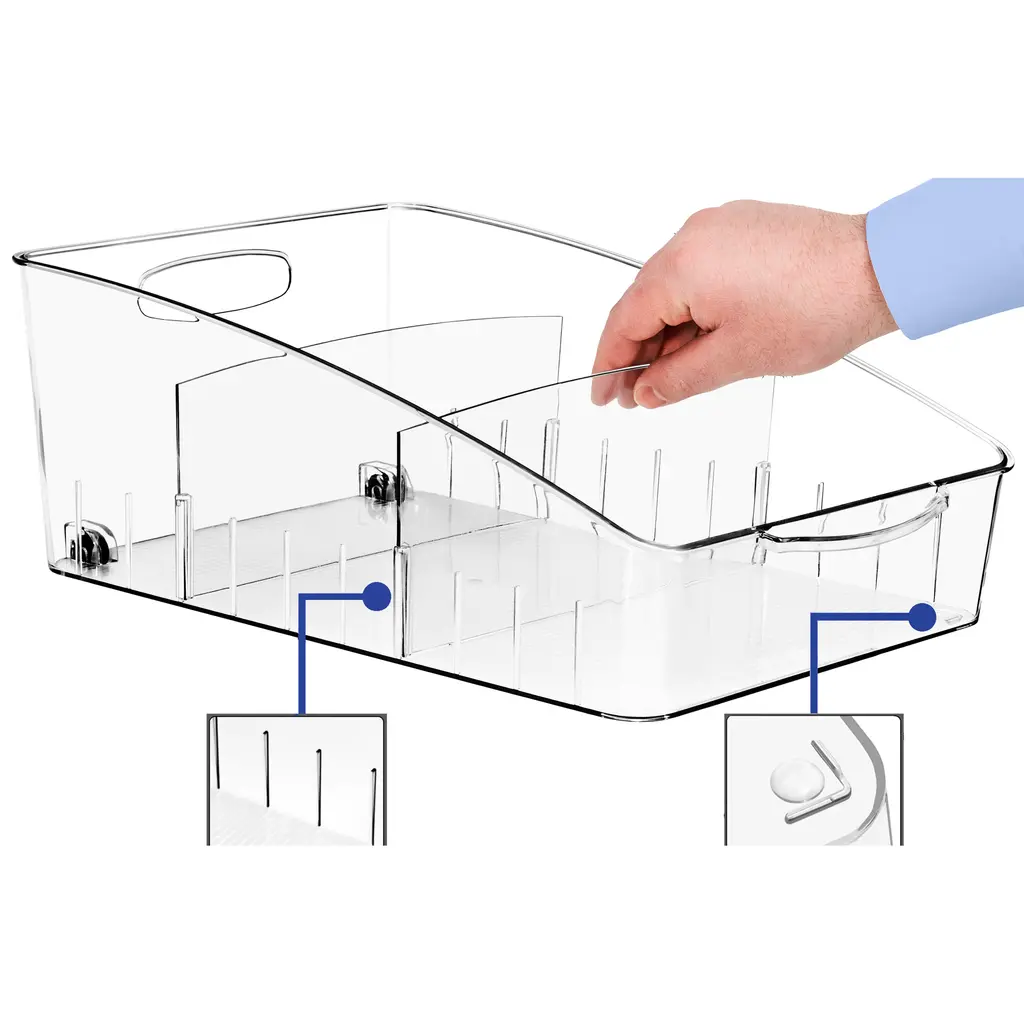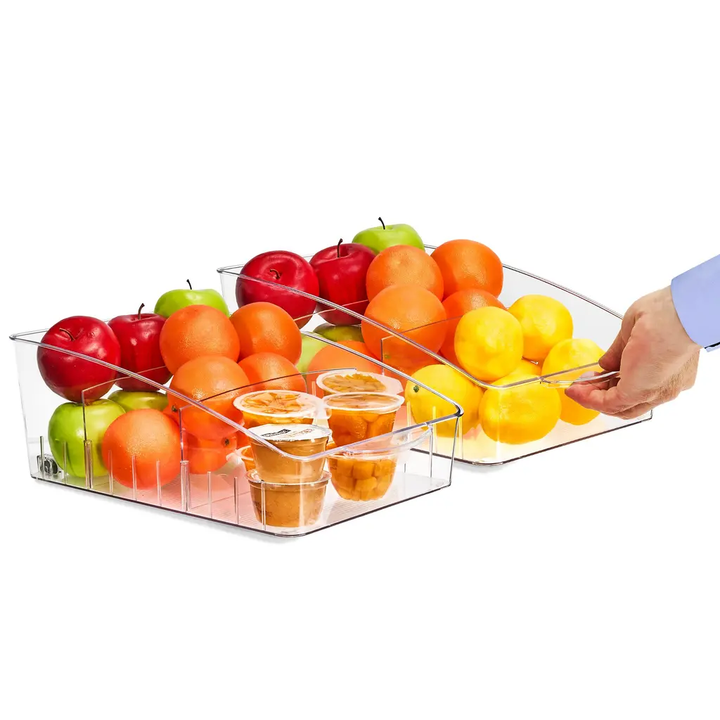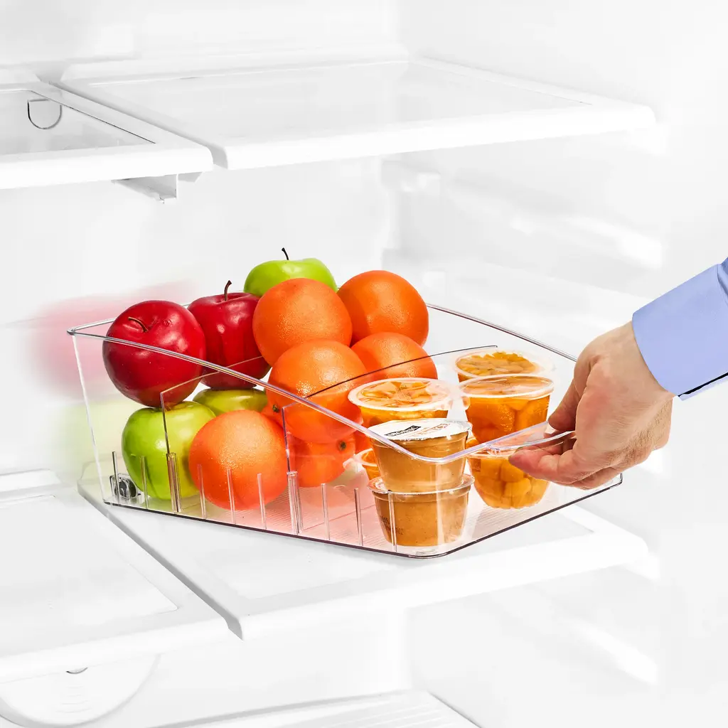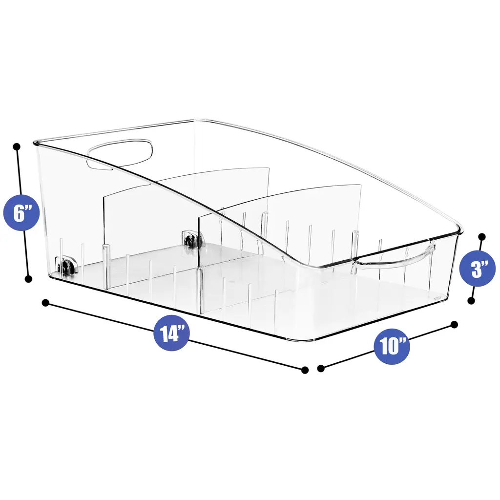 The Sorbus Clear Organizing Bins on Wheels make cooking, snacking, and packing simple and easy. Easily access small kitchen items that might otherwise get lost in the back of your fridge. Use the back wheels to pull the tray out smoothly and retrieve or restock items in seconds.Sorbus Rolling Fridge Caddy: Use back wheels to pull the tray out smoothly - No tipping or slipping - Easily access small kitchen items that might otherwise get lost in the back of your fridge Back Wheels & Front Stoppers: Back wheels roll items in and out smoothly while front stoppers provide security when the clear storage drawers are stationary Adjustable Dividers: Adjustable dividers allow you to group similar foods together and organize snacks Carry Handles: Transport plastic storage bins effortlessly due to easy-to-grip, built-in carry handles Design Details: Clear storage bins are made of BPA-free plastic - Clean fridge organizers by hand with soap and water
