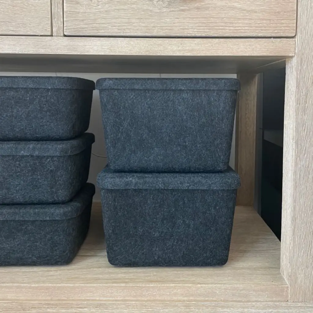 Storage with a touch of softness. This felt lidded bin crafted with recycled polyester corrals everything from pet toys to picture books to cold-weather accessories. We appreciate the display-worthy bin's structured sturdiness, stackability and clean, sculpted curves in any room of the house. The heathered black hue showcases unique subtleties and harmonizes effortlessly with modern decor. Useful on its own, the wide bin with lid organizes beautifully in multiples on open shelving, in a linen closet or under an entryway bench.
