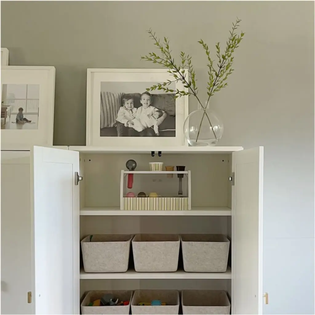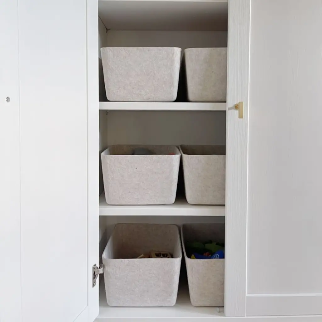 Storage with a touch of softness. This felt storage bin crafted with recycled polyester corrals everything from guest slippers to picture books to cold-weather accessories. We appreciate the display-worthy bin's structured sturdiness and clean, sculpted curves in any room of the house. The warm stone hue showcases unique subtleties and harmonizes effortlessly with modern decor. Useful on its own, the wide bin organizes beautifully in multiples on open shelving, in a linen closet or under an entryway bench.