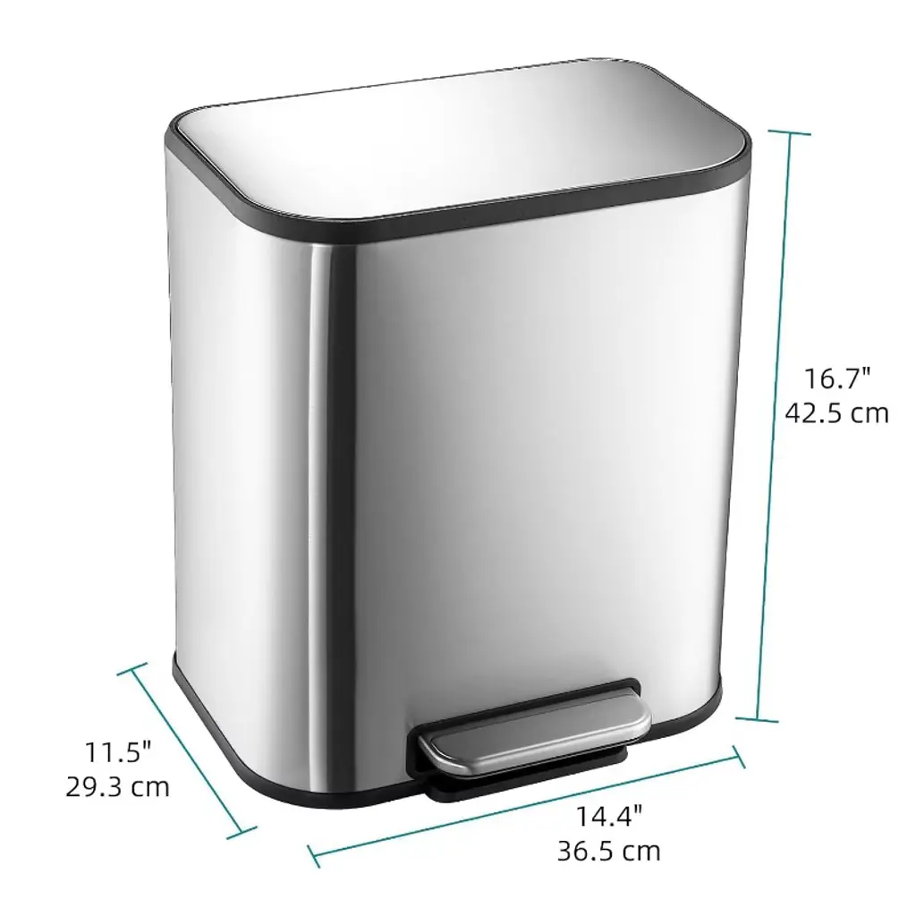 This stainless steel pedal trash can features a dual rust-proof coating for durability and fingerprint resistance, making it easy to clean. Equipped with a sturdy pedal for hands-free opening, it incorporates a built-in soft-close mechanism for quiet operation. The removable inner bucket with a handle simplifies emptying, while its capacity meets daily needs. Its minimalist design complements various home styles, balancing practical functionality with aesthetic appeal.