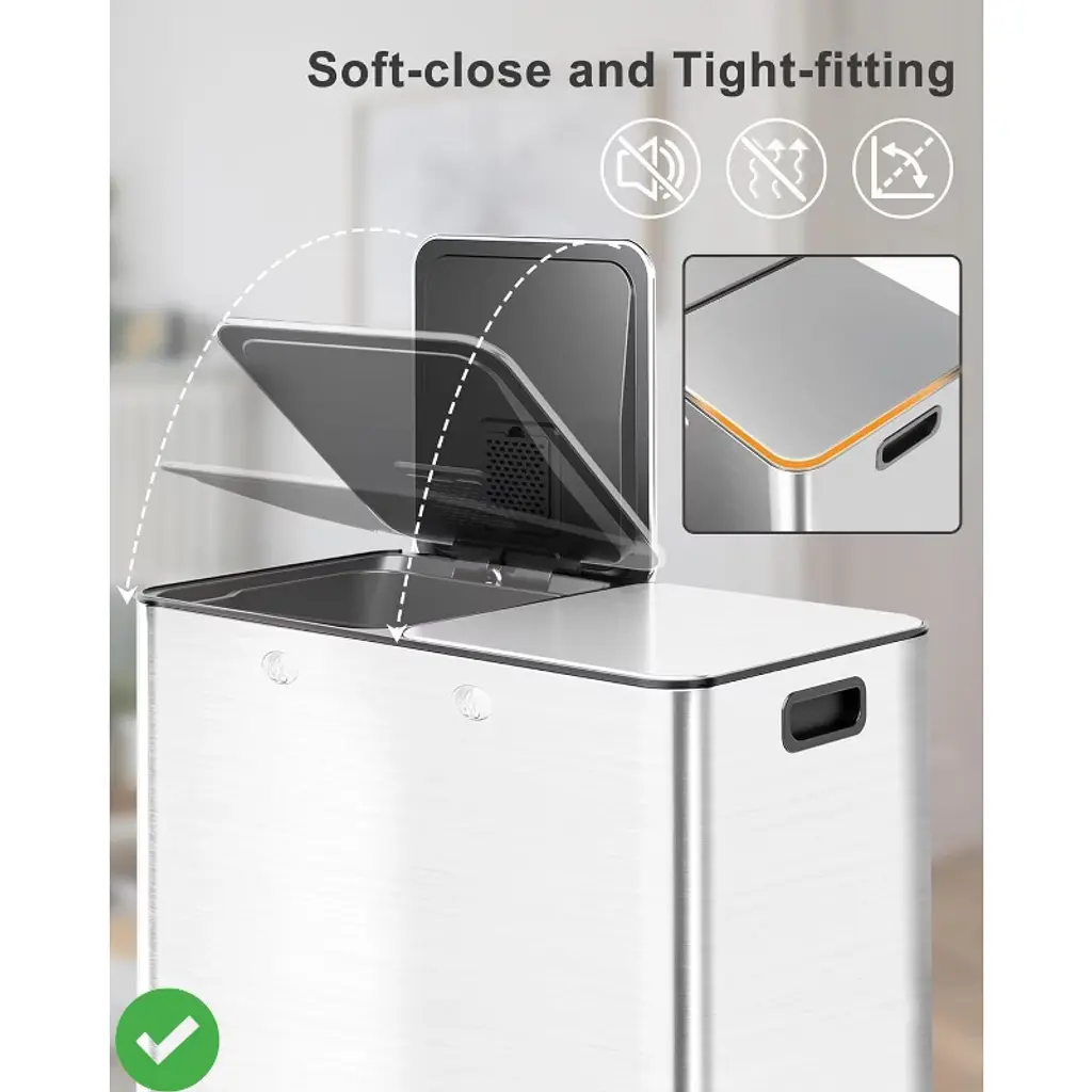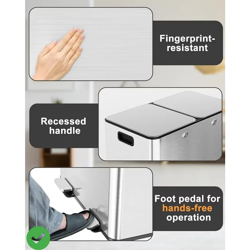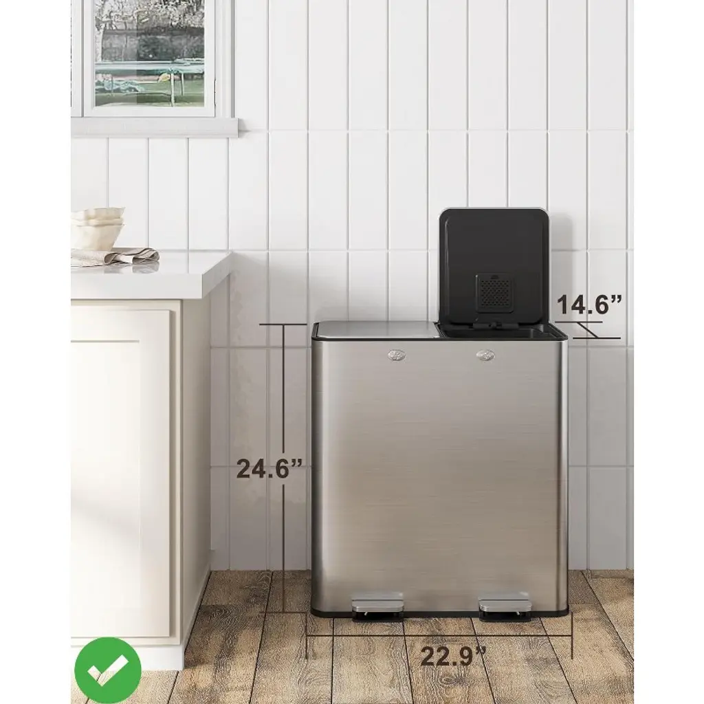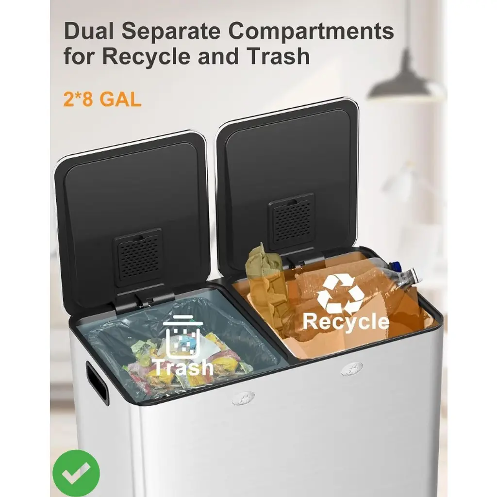 Dual 30 Liters - 16 Gallons Dual Trash Can with Recycle Bin, Stainless Steel Garbage Can with Separated Lid and Foot Pedal for Kitchen Deodorizer Compartment.