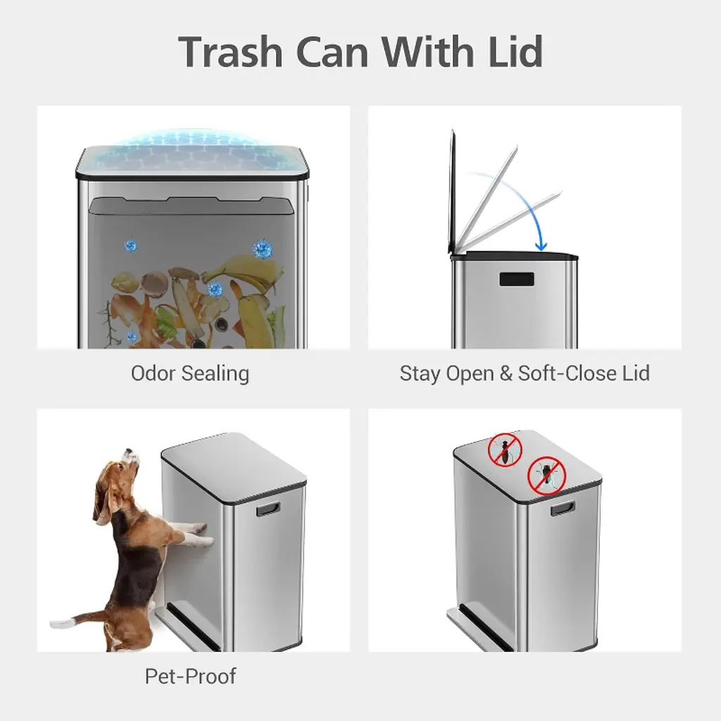 This Stainless Steel Dual Compartment Trash Can features 16-gallon (30L) inner bins, perfect for separating dry/wet waste or recyclables/non-recyclables. Ideal for kitchens, it maximizes efficiency while reducing odors and cross-contamination. The durable design keeps your kitchen trash can organized and hygienic.Enjoy effortless disposal with the sturdy Pedal Trash Bin design. The steel pedal opens the lid smoothly, allowing hands-free use while cooking or cleaning. No more touching lids—just step lightly for quick, sanitary waste disposal in your garbage can for kitchen.