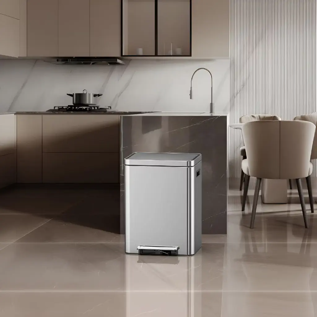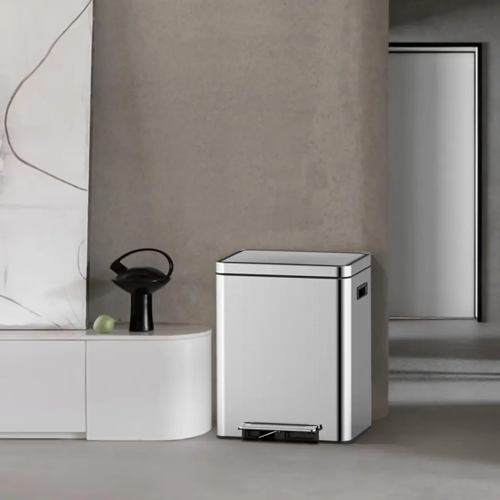 This stainless steel dual-compartment trash can features a compartmentalized design for easy sorting of waste and recyclables while saving space. Its foot-operated lid ensures hygienic use even with dirty hands or when busy. The polished surface resists fingerprints and wipes clean effortlessly for lasting tidiness. The removable inner bucket simplifies emptying and cleaning, preventing lingering odors.