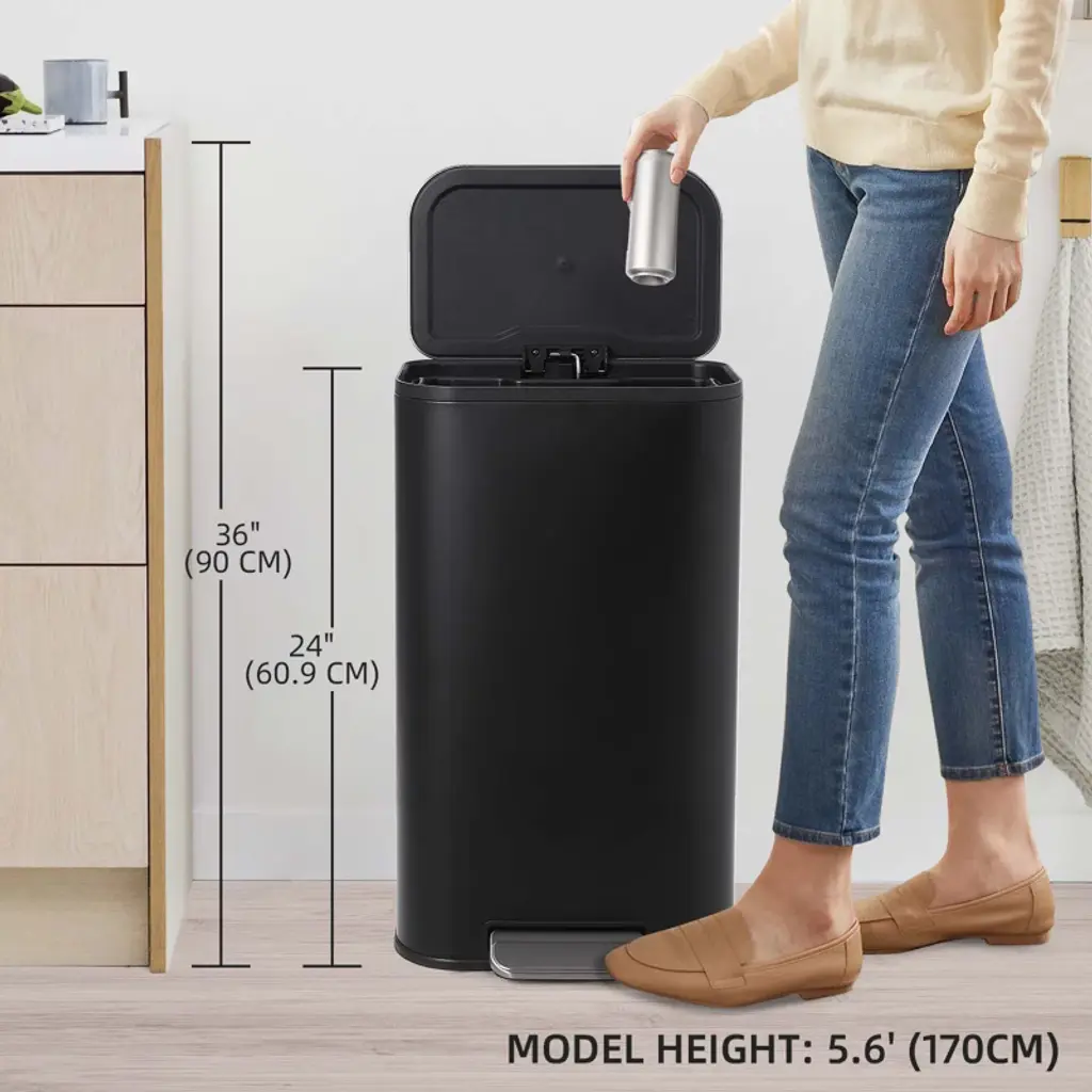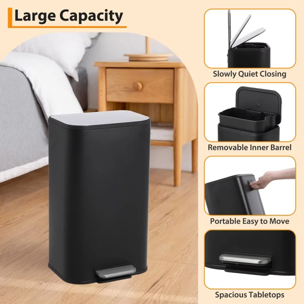 Elevate your daily routine with this quiet-close step-on trash can. Its slim rectangular design and thoughtful features make it an ideal choice for your kitchen, bathroom, or office.【Details】The narrow profile fits snugly into tight corners, maximizing space efficiency. The hands-free foot pedal ensures hygienic use, even with messy hands. An integrated bag ring keeps liners securely in place.The lid closes slowly and silently, maintaining a peaceful environment. The polished, fingerprint-resistant finish wipes clean easily, maintaining a sleek look with minimal effort.Combining minimalist aesthetics with robust functionality, this bin is a smart upgrade for a more streamlined and tidy space.
