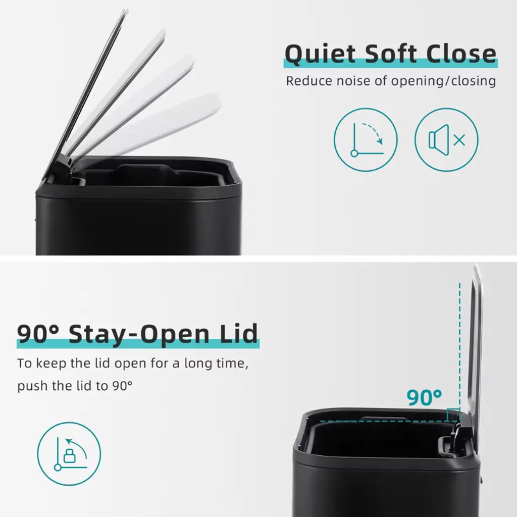 Elevate your daily routine with this quiet-close step-on trash can. Its slim rectangular design and thoughtful features make it an ideal choice for your kitchen, bathroom, or office.【Details】The narrow profile fits snugly into tight corners, maximizing space efficiency. The hands-free foot pedal ensures hygienic use, even with messy hands. An integrated bag ring keeps liners securely in place.The lid closes slowly and silently, maintaining a peaceful environment. The polished, fingerprint-resistant finish wipes clean easily, maintaining a sleek look with minimal effort.Combining minimalist aesthetics with robust functionality, this bin is a smart upgrade for a more streamlined and tidy space.