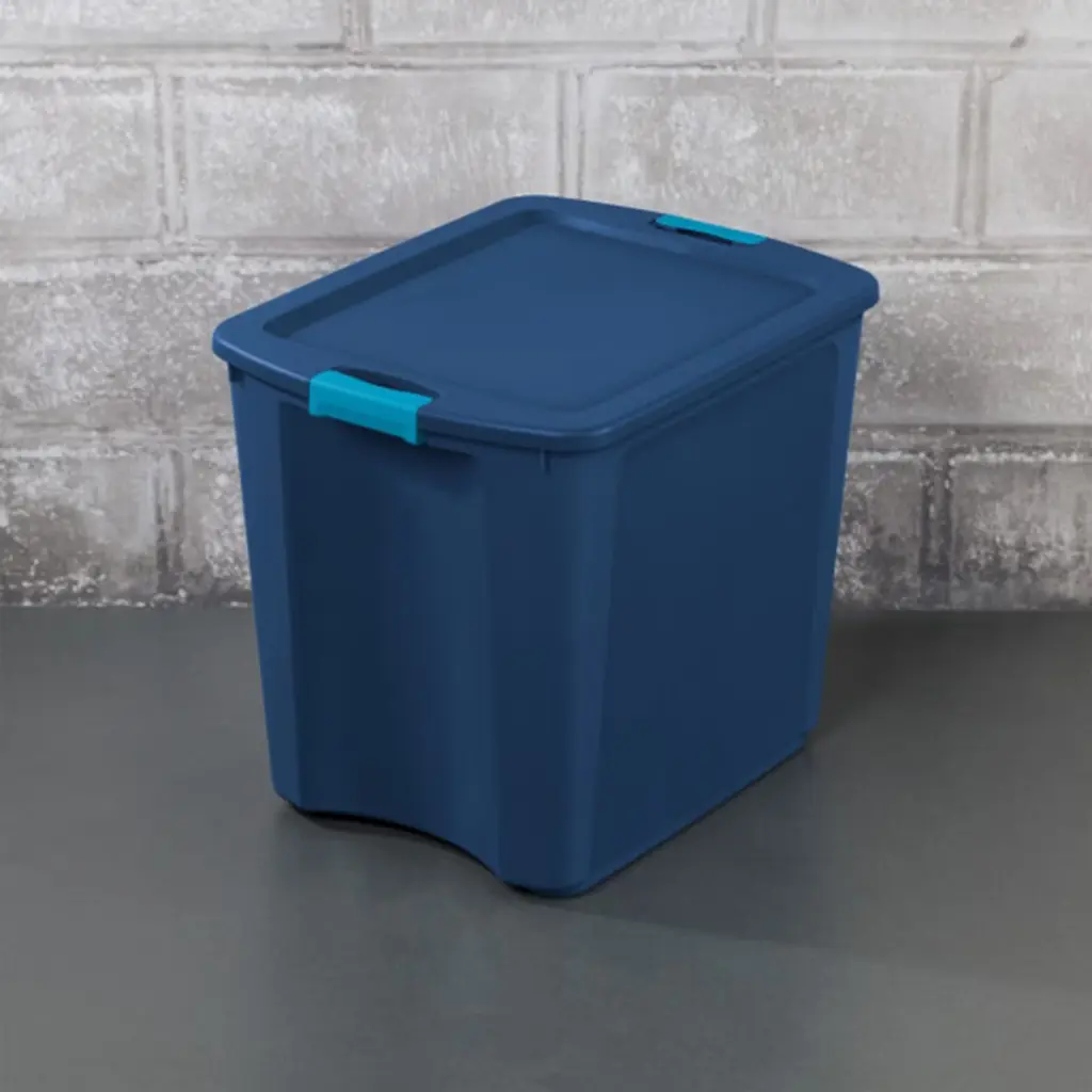 Ensure yourself an optimal storage solution and keep your home or office spaces decluttered with the 4-pack of Sterilite Latching Lid Storage Tote Containers. Designed with comfortable carrying thru handles and heavy-duty latching lids, these boxes are ensured to keep your extra blankets, seasonal clothing, decorations, and more clean and safe. With the color-accented latches, you are easily able to grab what you need at a glance with a tight, secure attachment to the lid of the base. Stack the 4 containers in the garage, basement, or shed with the recessed lids to keep your equipment out of sight when not in use. The 26-gallon capacity provides plenty of space to hold all of your large equipment while efficiently satisfying all of your storage needs. Whether you're storing items for later or moving from place to place, secure your valuables in the 4-pack of Latching Lid Storage Tote Containers from Sterilite.