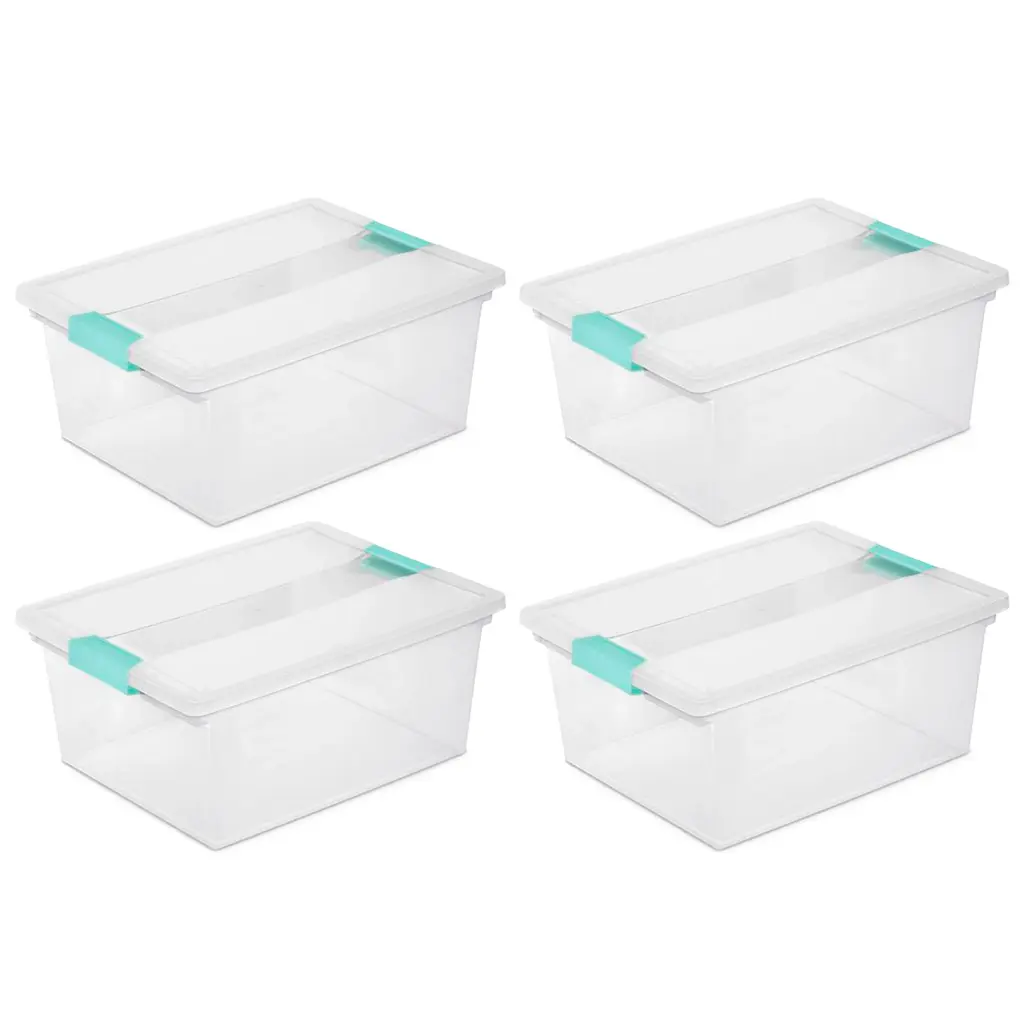 Need help getting organized? Maintain order and cleanliness in your household with these Sterilite 64-Quart Latching Storage Boxes, the perfect storage solutions for your household needs. You've got organizing your space under control with these plastic organizer boxes, featuring a modern space-saving shape and innovative hinging lids. Simply undo 1 latch and lift the lid for easy access, all with 1 hand. The other latch stays attached and acts as a hinge, even when the lid is opened all the way. These organizer bins have a capacity of 64 quarts, ideal for storing off-season clothing, sporting equipment, boots, blankets, and other bulky items around the home. With clear bases, you can easily view contents inside for seamless and efficient organization. No more guessing or stressing about what's inside! The recessed lids allow same-size storage boxes to stack neatly on top of each other to use vertical storage space efficiently. The overall outer dimensions of these items are 23.75 inches long, 16 inches wide, and 13.5 inches tall, with interior dimensions measuring 19.38 inches long, 13.13 inches wide, and 13 inches tall, perfect for storage in closets, offices, basements, or garages. Clear some clutter from your life and tuck away your belongings in the 64-Quart Latching Storage Boxes.
