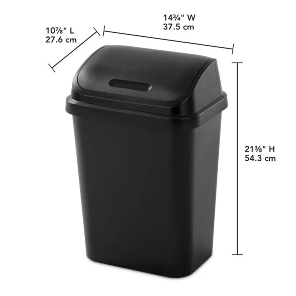 Discover the convenience and style of the Sterilite 7.8-Gallon SwingTop Wastebaskets. Perfectly designed for smaller spaces, each waste bin is a versatile solution for your office, dorm room, or laundry room. With outside dimensions of 14.75 inches by 10.87 inches by 21.37 inches, it's a space-efficient choice that fits snugly against walls or cabinets. Securely staying upright for your convenience, the lid opens effortlessly with just a touch. Its swing-in feature facilitates easy disposal, complemented by a discreet bag-hiding rim for a tidy look. Built for durability, the wastebasket is designed to withstand the demands of day-to-day use in busy rooms. The contemporary design, square profile, and sleek lines effortlessly enhance any home decor, while the classic color adds a touch of sophistication. Its mid-sized capacity is perfect for high-traffic areas, accommodating a standard 8-gallon trash liner. Crafted from easy-to-clean plastic with a textured surface, maintenance is a breeze. Versatile and stylish, it's the ideal solution for spaces like the kitchen, bathroom, bedroom, dorm room, mudroom, or basement. No need for batteries or complicated mechanisms, these wastebaskets are designed for hassle-free use. Enjoy home organization with these 7.8-Gallon SwingTop Wastebaskets from Sterilite for a combination of practicality, durability, and contemporary style.