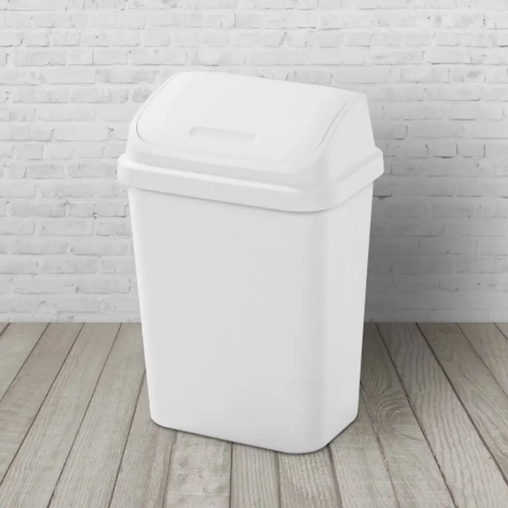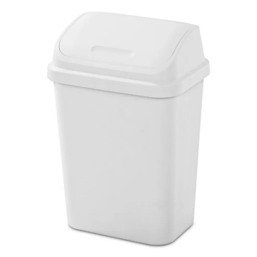 Discover the convenience and style of the Sterilite 7.8-Gallon SwingTop Wastebaskets. Perfectly designed for smaller spaces, each waste bin is a versatile solution for your office, dorm room, or laundry room. With outside dimensions of 14.75 inches by 10.87 inches by 21.37 inches, it's a space-efficient choice that fits snugly against walls or cabinets. Securely staying upright for your convenience, the lid opens effortlessly with just a touch. Its swing-in feature facilitates easy disposal, complemented by a discreet bag-hiding rim for a tidy look. Built for durability, the wastebasket is designed to withstand the demands of day-to-day use in busy rooms. The contemporary design, square profile, and sleek lines effortlessly enhance any home decor, while the classic white color adds a touch of sophistication. Its mid-sized capacity is perfect for high-traffic areas, accommodating a standard 8-gallon trash liner. Crafted from easy-to-clean plastic with a textured surface, maintenance is a breeze. Versatile and stylish, it's the ideal solution for spaces like the kitchen, bathroom, bedroom, dorm room, mudroom, or basement. No need for batteries or complicated mechanisms, these wastebaskets are designed for hassle-free use. Enjoy home organization with these 7.8-Gallon SwingTop Wastebaskets from Sterilite for a combination of practicality, durability, and contemporary style.