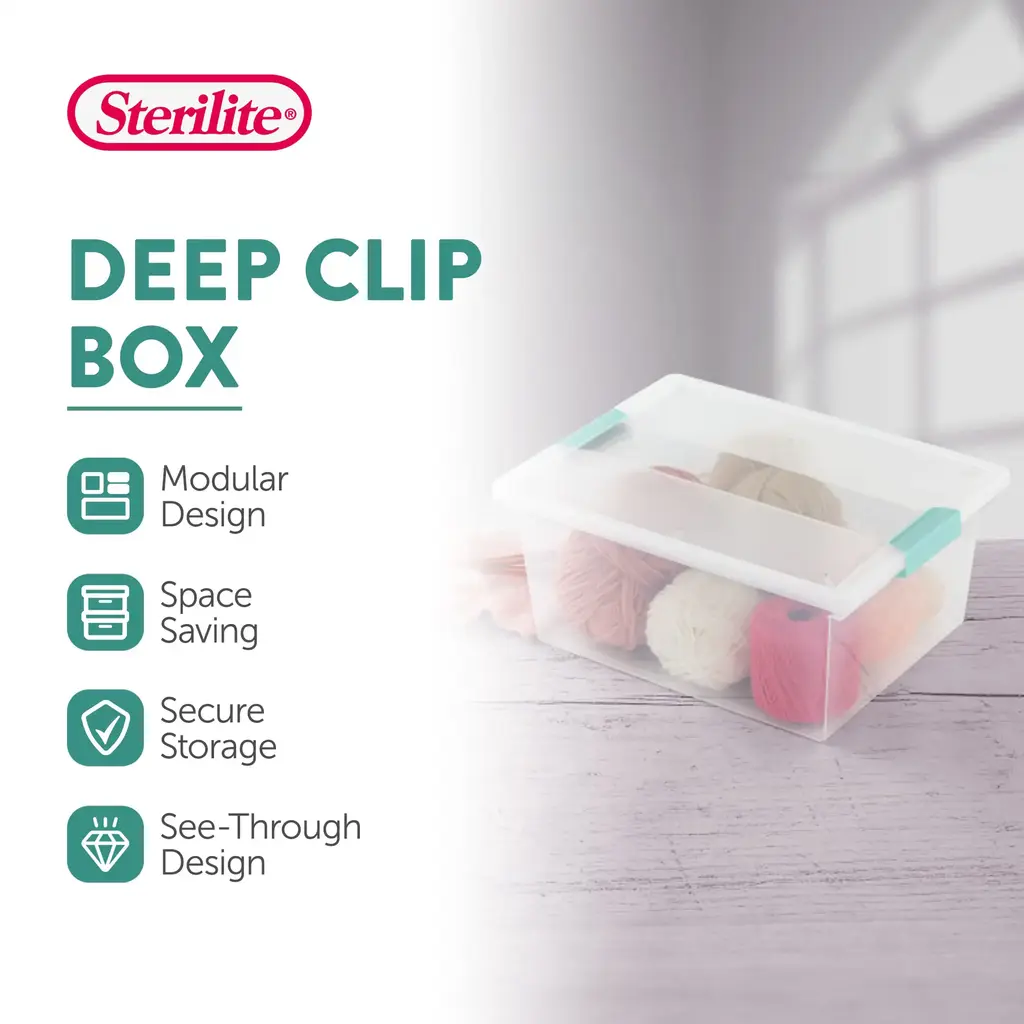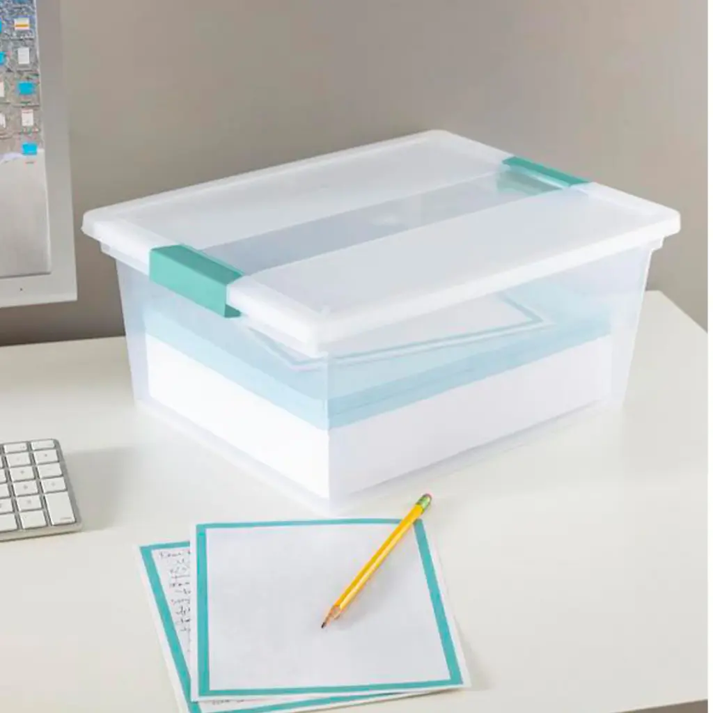 Organize the closet, office, classroom, craft supplies, or playroom, putting everything in its proper place with the help of these Sterilite 18.7 Gallon Large Plastic Stackable Storage Bins with Clear Latch Lids. Make your home clutter-free and aesthetically pleasing with these packs of durable clear bins. These durable storage totes are ideal for storing magazines, craft books, school supplies, or longer craft items safely in your home, classroom, or office. They can also be used for construction paper, felt, coloring books, and more. Whether you're safely storing and organizing standard 8.5 by 11-inch notebooks, paper dolls, newspaper clippings, or knick-knacks, you can easily identify contents from the outside thanks to the clear plastic design. Indexed lids allow multiple boxes to be stacked securely maximizing vertical spacing. Durable and built for long-term storage, you can rest assured your items will remain free from dust, dirt, or debris, even when stored in unfinished basements, garages, or exterior storage rooms. Enjoy the peace-of-mind organization can bring to your home with these Large Clear Plastic Storage Container Totes from Sterilite. Go and get your own 6-pack today and feel relieved by keeping your home or workspace free of mess. Set of (4) deep clip boxes that create a storage system for everything from decorations to craft supplies to letter-sized files and notebooks or small keepsakes Clear bins allow for easy visibility to see what's inside without having to open them up Robust latches offer extra security that the lid will stay attached, and the textured surface makes for a sure grip when carrying Indexed lids and contoured bases allow for stacking and provide access to untapped vertical storage space in your home or classroom Ideal for keeping crafting supplies, office supplies, small toys or creative projects, or keepsakes in a garage or basement Material: Plastic Maximum weight capacity: 2.4 cubic feet/18.7 gallons Lid Color: Clear with blue aqua latch handles Base Color: Clear Dimensions (L x W X H): 14 x 11 x 6.25 inches Weight: 1.5 pounds Manufacturer warranty: 1-year warranty Quantity: 4