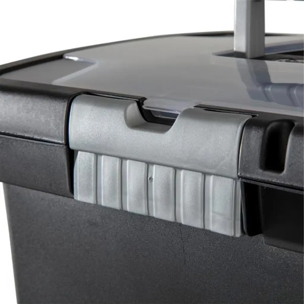 Finding a perfect solution for storing and moving your moving letter-size hanging file folders will be at ease with the 4-Pack of Sterilite Portable File Boxes. These organizers will undoubtedly help you organize your documents or transport file folders effectively. Features an easy-access, in-lid compartment, and divided sections that provide extra room for your pens, scissors, calculator, notepad, and other small things. The lid locks into place with the titanium gray latches, keeping everything sealed inside. Also, the clear lid makes it easy to check its contents without showing everyone what's inside. With a top handle design, you can easily transport and carry these boxes. Stackable, and allows for efficient use of vertical space thanks to indexed cover design. The file box has a large capacity and fits letter-sized hanging files, making it perfect for keeping important documents safe. It can be locked shut with a small padlock ensuring the privacy and safety of your papers. Keep your documents safe in this 4-Pack of Sterilite Portable File Box.