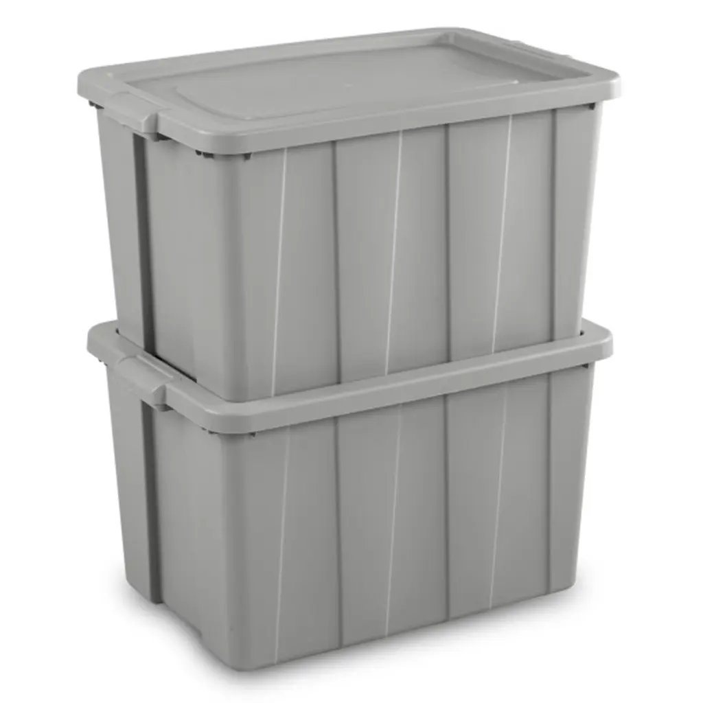 Take advantage of that storage space in basements, garages, or attics with this rugged 12-pack of Sterilite Tuff1 30-Gallon Storage Totes. These storage bins feature durability and strength for added peace of mind that contents will stay safely stored inside. These 30-gallon storage containers make a great solution for storing away camping supplies, sporting equipment, and seasonal items in more challenging environments. Made from polyethylene plastic, these storage totes are rugged and resilient to impact even in colder temperatures, making them ideal for more active storage needs. Contoured end panels and integrated handles make for a comfortable grip when carrying. The deep recessed lid allows multiple storage totes to stack securely for efficient use of vertical space. The channeled walls and thick reinforced rim provide added strength and rigidity. The overall dimensions are 30 inches long, 20 inches wide, and 17 inches tall. Save space and store away anything you need with these Sterilite Tuff1 30-Gallon Storage Totes. Storage bins and lids are resilient to temperature and impact, ideal for storing items in basements, garages, and attics Great for storing camping supplies, sporting, equipment, seasonal items, and more Large storage bins sport 30-gallon capacity and measure 30 inches long, 20 inches wide, and 17 inches tall each Contoured end panels create integrated handles for easier lifting Indexed lids offer secure stacking capabilities for efficient use of vertical space Color: Gray Dimensions (L x W x H): 30 x 20 x 17.13 inches Weight: 7.75 pounds Quantity: 12