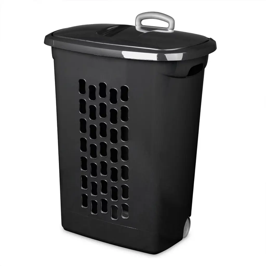 Make laundry day more convenient with the Sterilite Ultra Wheeled Hamper, designed to make transporting your clothes easier than ever. Featuring smooth-gliding wheels and a retractable handle, this hamper allows you to easily pull it from room to room, effortlessly transporting laundry to and from the laundry room. Whether you’re carrying a heavy load or simply moving it around your home, the wheeled design minimizes the effort required, turning laundry day into a more manageable task. When lifting is necessary, the hamper includes integrated handles on each side, offering a comfortable and secure grip for carrying. The flip-top lid keeps your clothes neatly contained, while the large hole pattern promotes excellent airflow, preventing odors and allowing your laundry to stay well-ventilated. This feature helps keep your clothes fresh between washings. Constructed with durable materials and a reinforced rim, the Sterilite Ultra Wheeled Hamper is built to withstand the rigors of everyday use. Perfect for apartments, dorm rooms, or homes with limited space, it provides an ideal solution for storing dirty clothes and transporting laundry with ease. The hamper’s overall dimensions are 21 inches long, 13.75 inches wide, and 28.4 inches tall, making it compact yet spacious enough for your laundry needs. Say goodbye to the hassle of moving laundry and enjoy a more efficient, organized routine with this practical and durable hamper.
