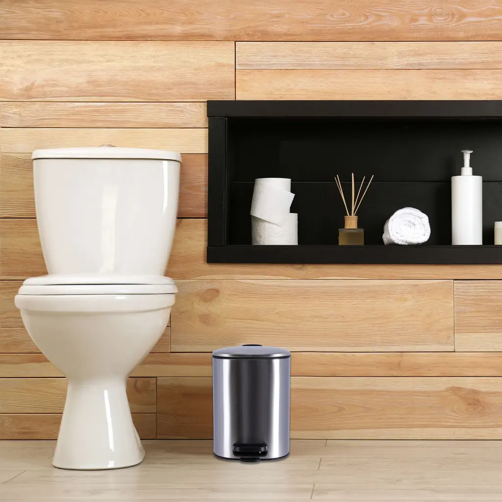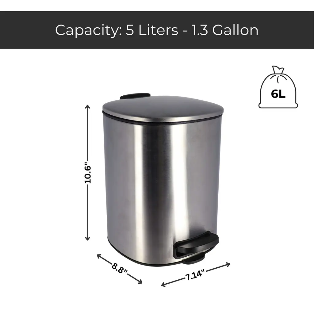 Stylish Metal Trash Can With Silent Soft Close Lid 5L - 1.3 Gal Foot Pedal - 1.3 Gallons - Chrome