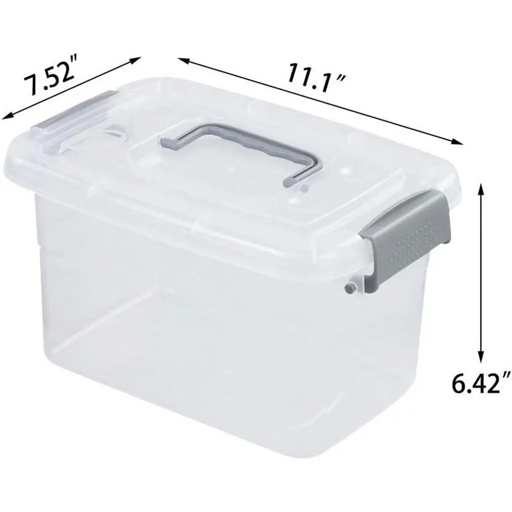 Pack of 6 plastic storage containers with lids Outside size of one box is 11.1'' x 7.52'' x 6.42'' Ideal for bedroom, kitchen, storage room, living room, office and more Items suitable for storage: pen, notebook, clips, puzzle, building block, pigment, brush, baking tool and so on Suitable for organizing many kinds of items all around the house