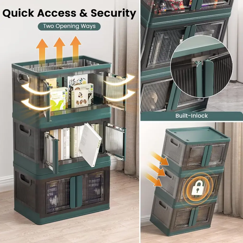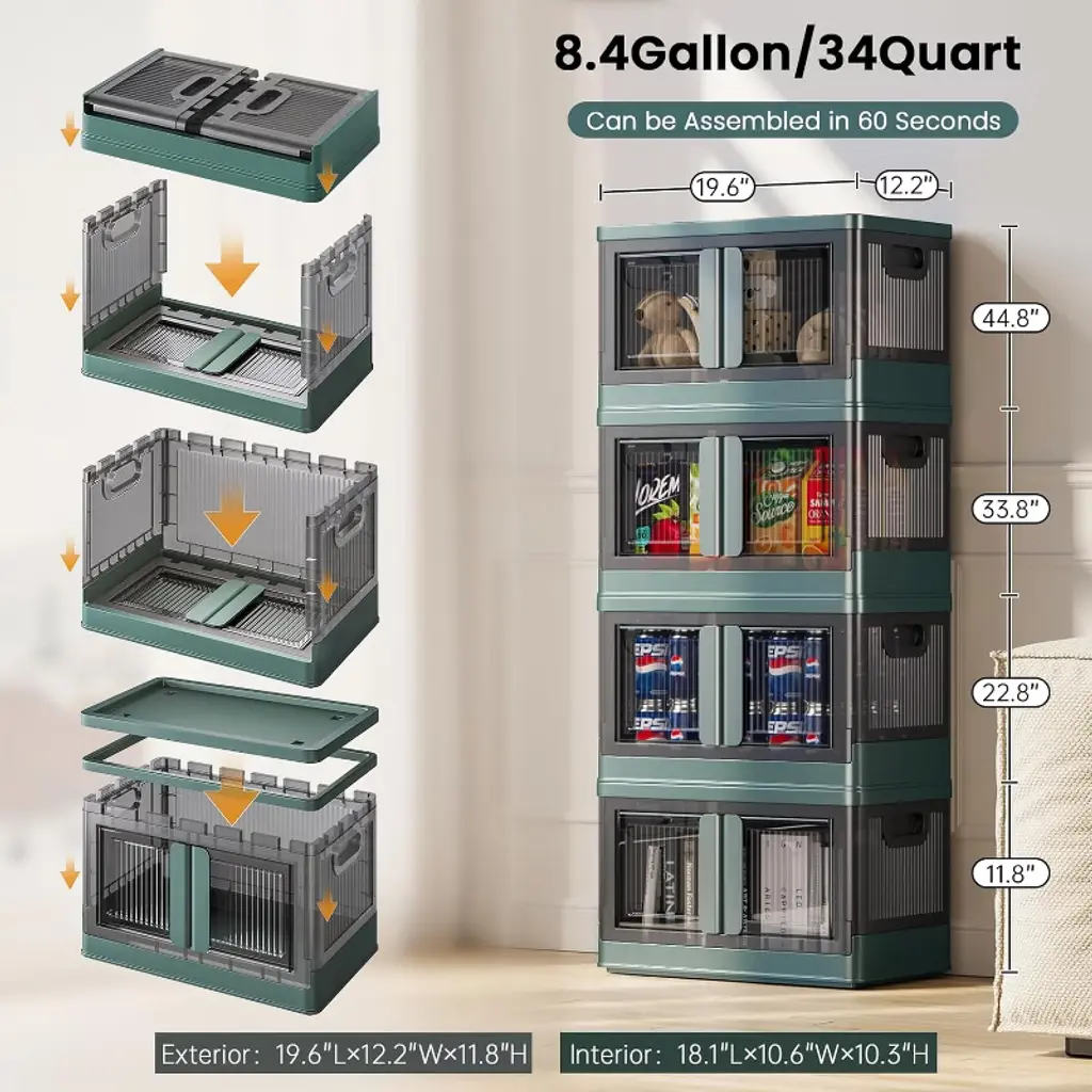 Multi-Scenario Storage: These versatile storage bins are suitable for organizing clothes, toys, crafts, beddings, books, snacks, and other miscellaneous items. 8.4-gallon super capacity (34 quarts) - holds 28 x 500mL bottles (Tested) Quick Assemble & Fold: Our storage containers can be assembled in 1 minute and folds down to 4 inches when not in use, easily tucking under beds/tight spaces—saves 80% of space. Heavy-duty PP plastic (2mm thick walls) supports 110 lbs (50 kg)/pack Stable Stacking & Move: Each storage bin features a built-in recessed 4-wheel base that can move side-to-side, with a full-ground contact design for enhanced stability. The lid of each bin includes 4 built-in grooves for secure stacking Quick Access & Security: Clear doors let you see contents instantly, open-front design allows effortless item retrieval. Additionally, the built-in lock clasp prevents accidental opening during transport Accurate Size Design: Exterior: 19.6"L x 12.2"W x 11.8"H( Internal: 18.1"L x 10.6"W x 10.3"H). They can meet most of your daily storage needs, ideal for closets, garages, RVs, and small spaces
